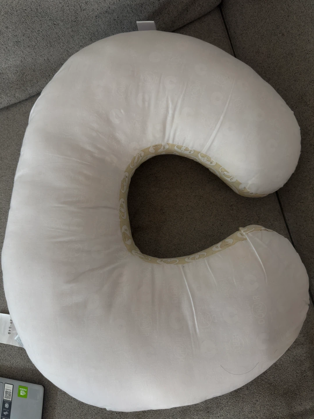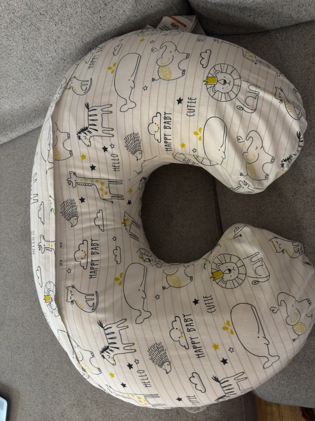 This is a Boppy nursing pillow. It's white with a cute animal print. It has 2 covers which are removable and machine washable. It's designed to provide support during feeding and tummy time.