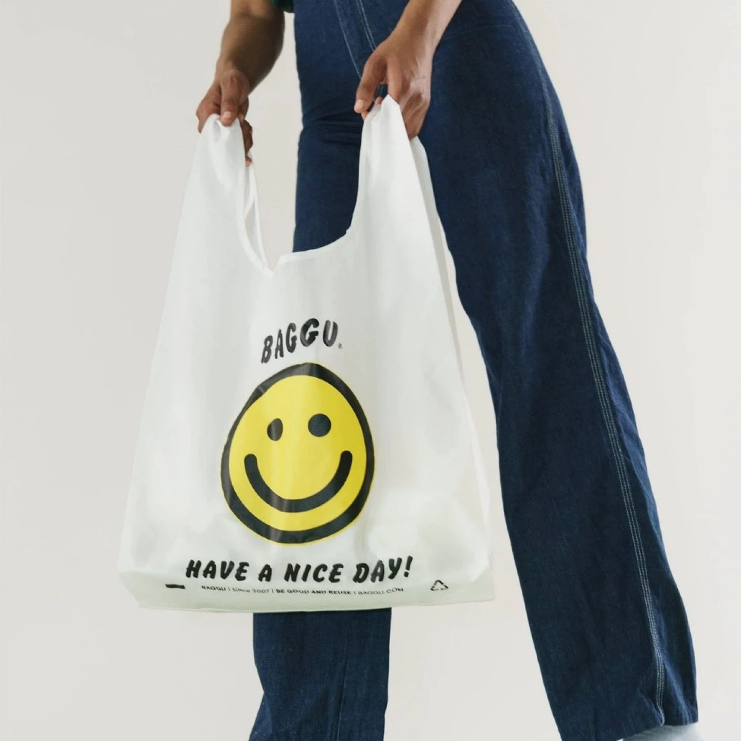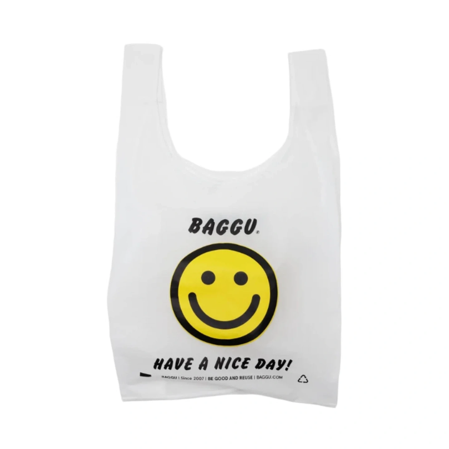 This is a brand new, never used BAGGU reusable shopping bag. It features the iconic smiley face design and the "Have a Nice Day!" slogan. Made from durable material for everyday use. Retails for $22 +tax new.