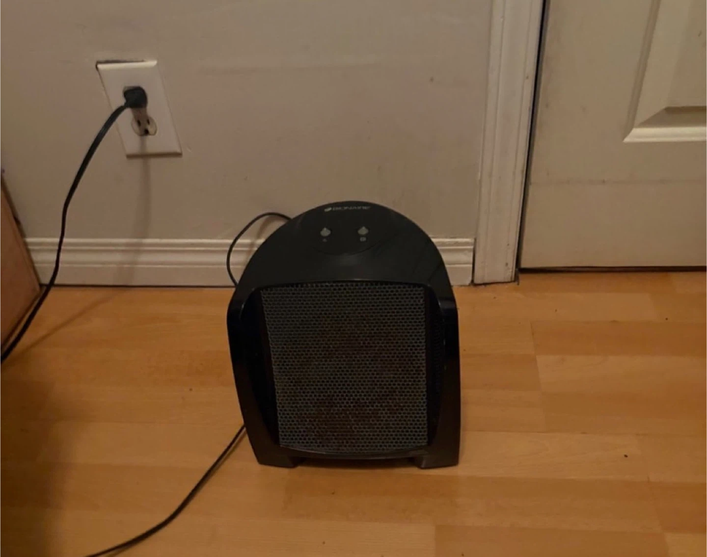 This is a Bionaire portable electric heater. It's black and comes with a power cord. It has two buttons on top for control. This heater is good for warming up small spaces quickly!