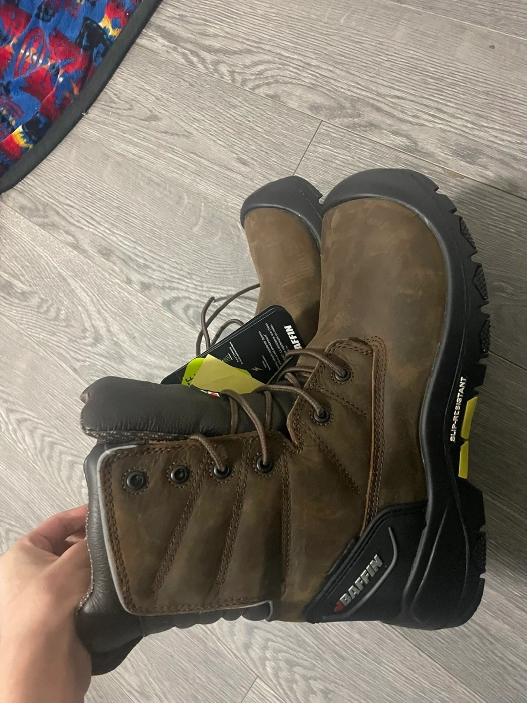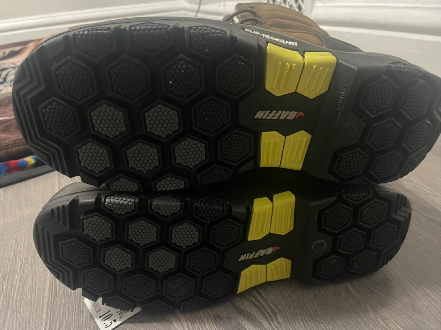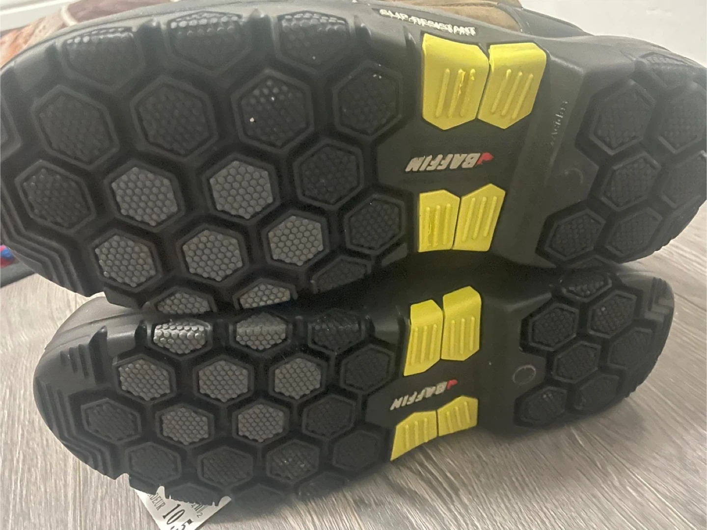 Baffin work boots with slip-resistant soles and a durable construction. Features a brown leather upper with black accents. Size is 10.5.
