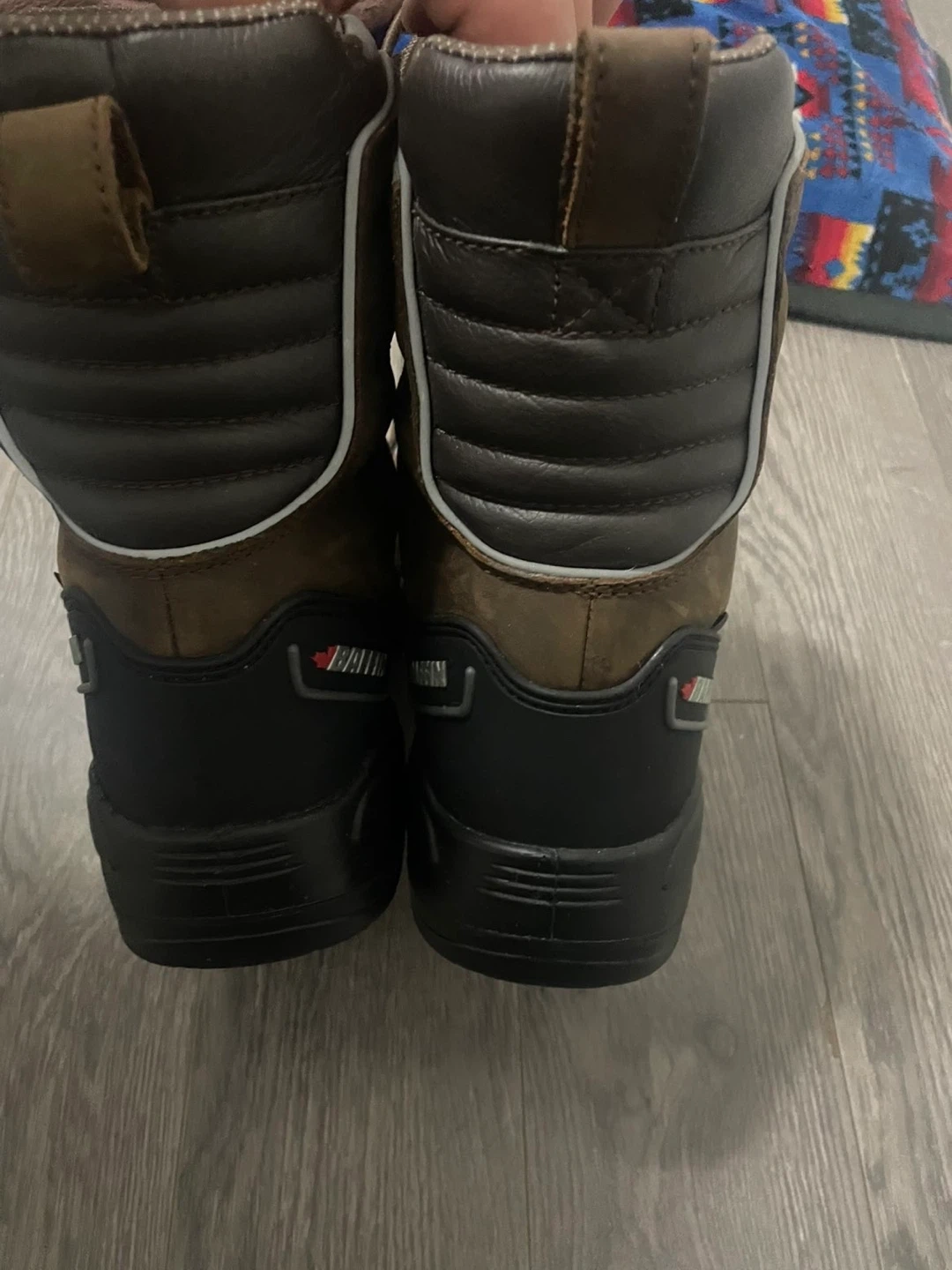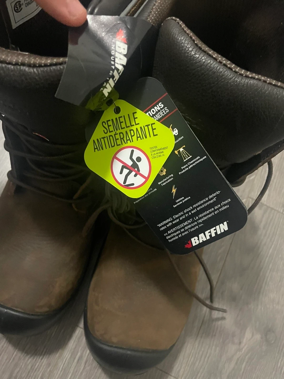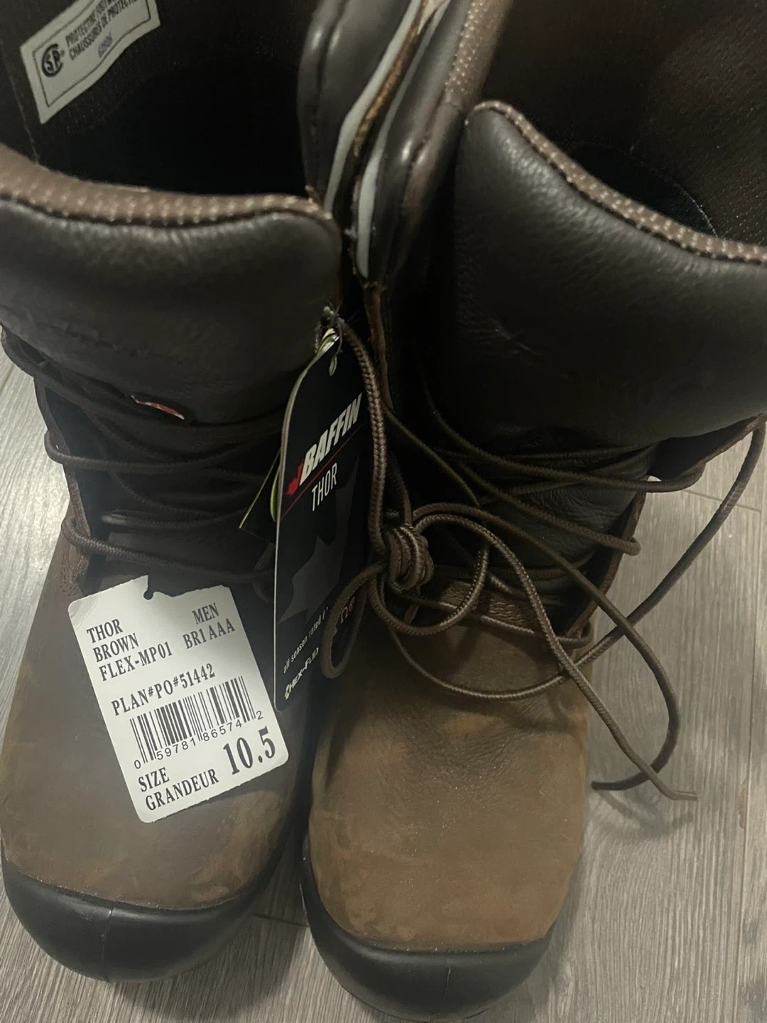 Baffin work boots with slip-resistant soles and a durable construction. Features a brown leather upper with black accents. Size is 10.5.