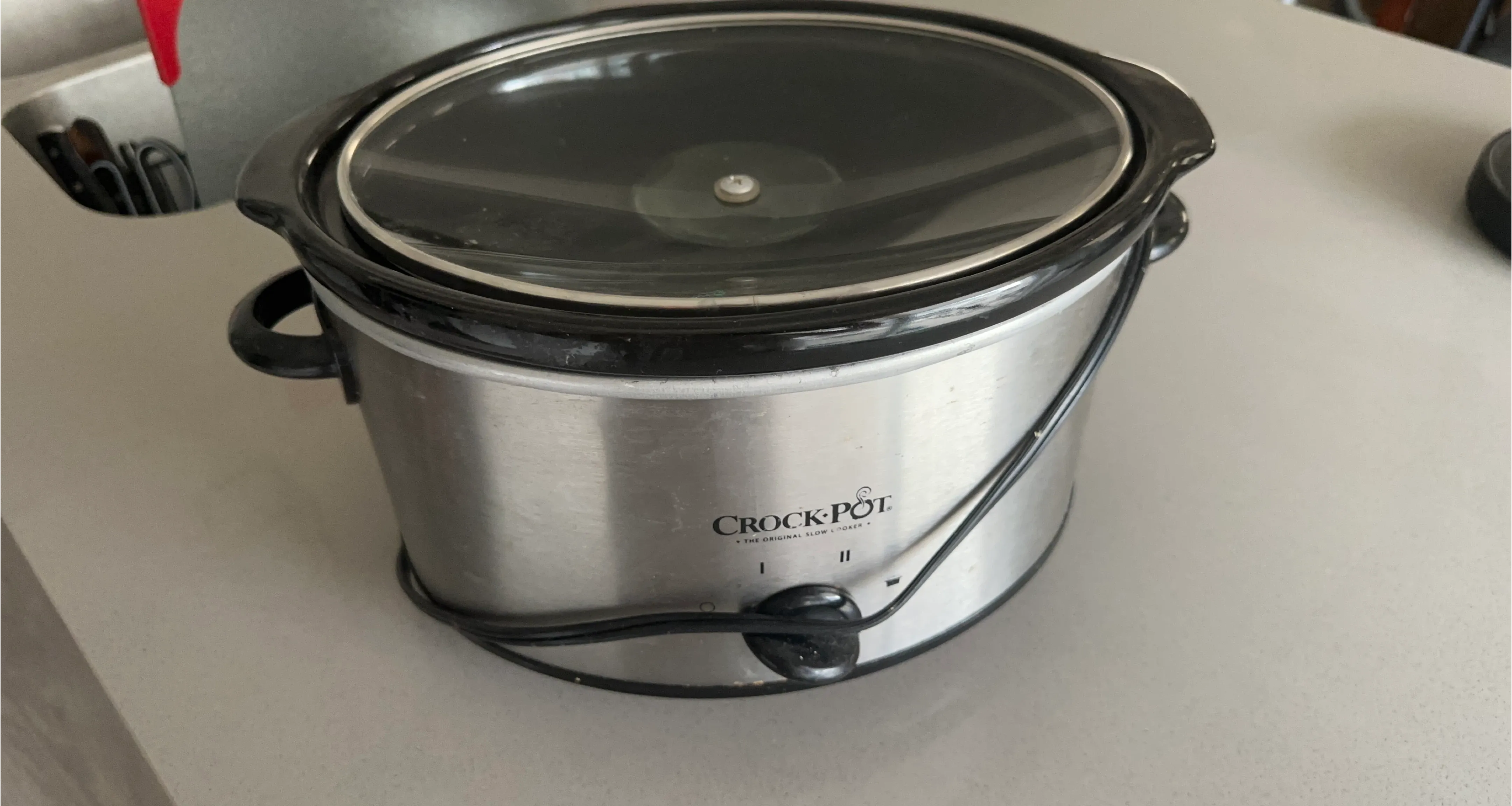 This is a Crock-Pot slow cooker. It has a glass lid and metal exterior. Settings include low and high.