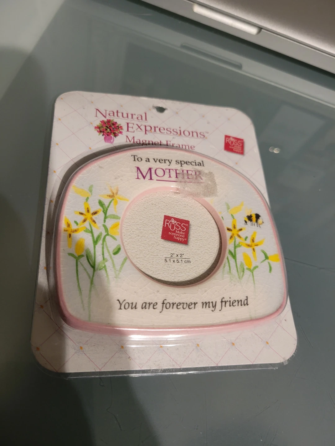 This is a new Natural Expressions magnet frame, perfect for displaying a 2" x 2" photo of your mother. The frame features a lovely floral design with the phrase 'You are forever my friend'. It's still in its original packaging. I'm selling it for a great price!