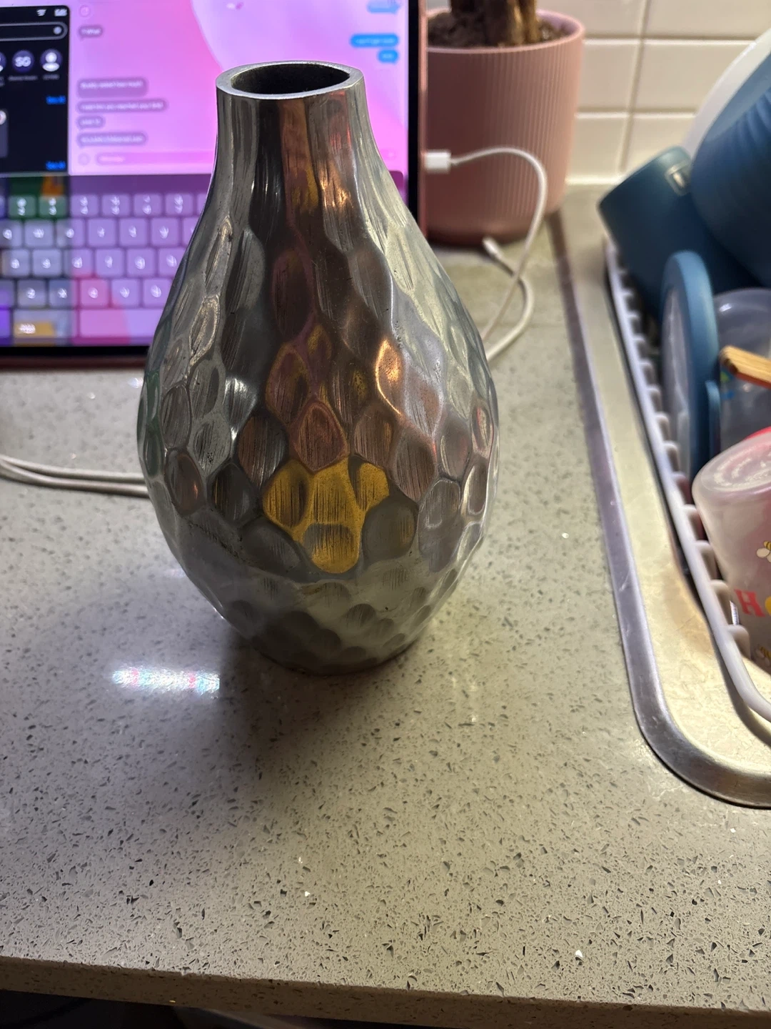 This decorative vase has a unique hammered texture. It's made of metal with a silver and gold finish. Perfect for displaying flowers or as a standalone decor piece!