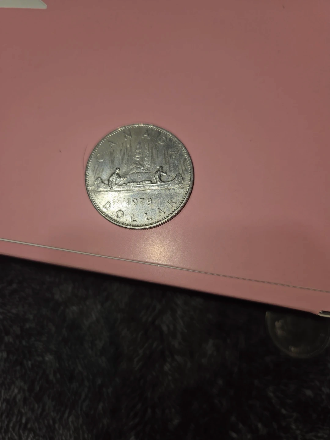 This is a Canadian dollar coin from 1979. It features a depiction of a canoe with two figures, with trees in the background. A great piece for coin collectors!