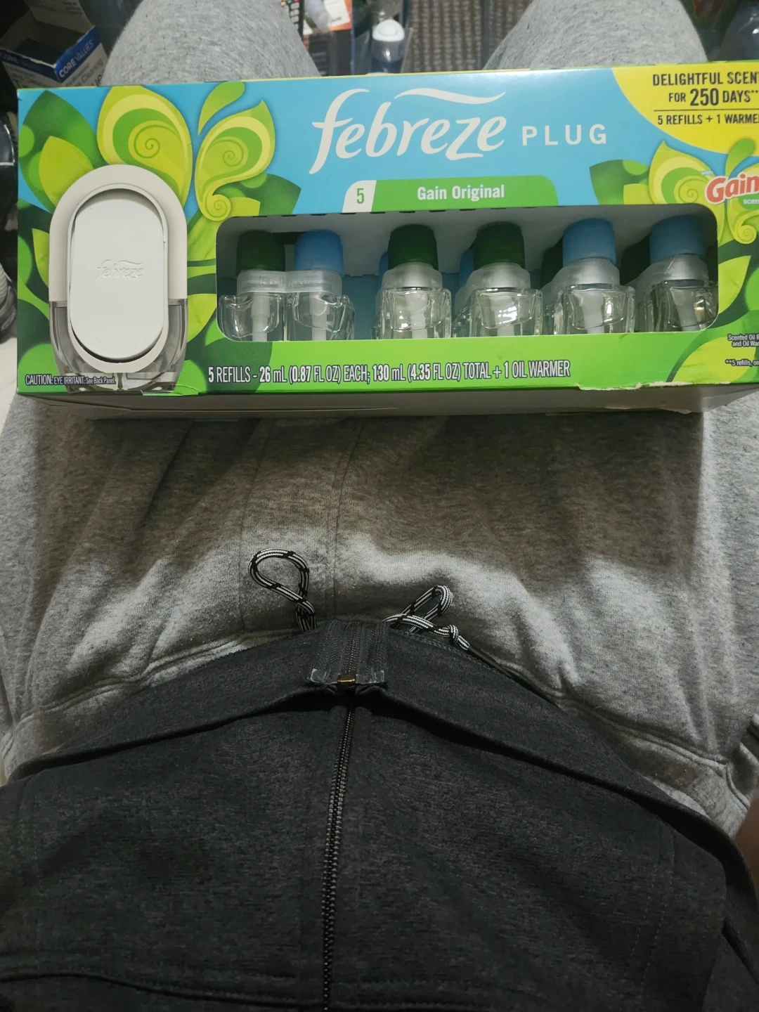 This Febreze Plug set includes 5 Gain Original scent refills and 1 oil warmer. Each refill is 26 mL (0.87 FL OZ). The total for the refills is 130 mL (4.35 FL OZ).