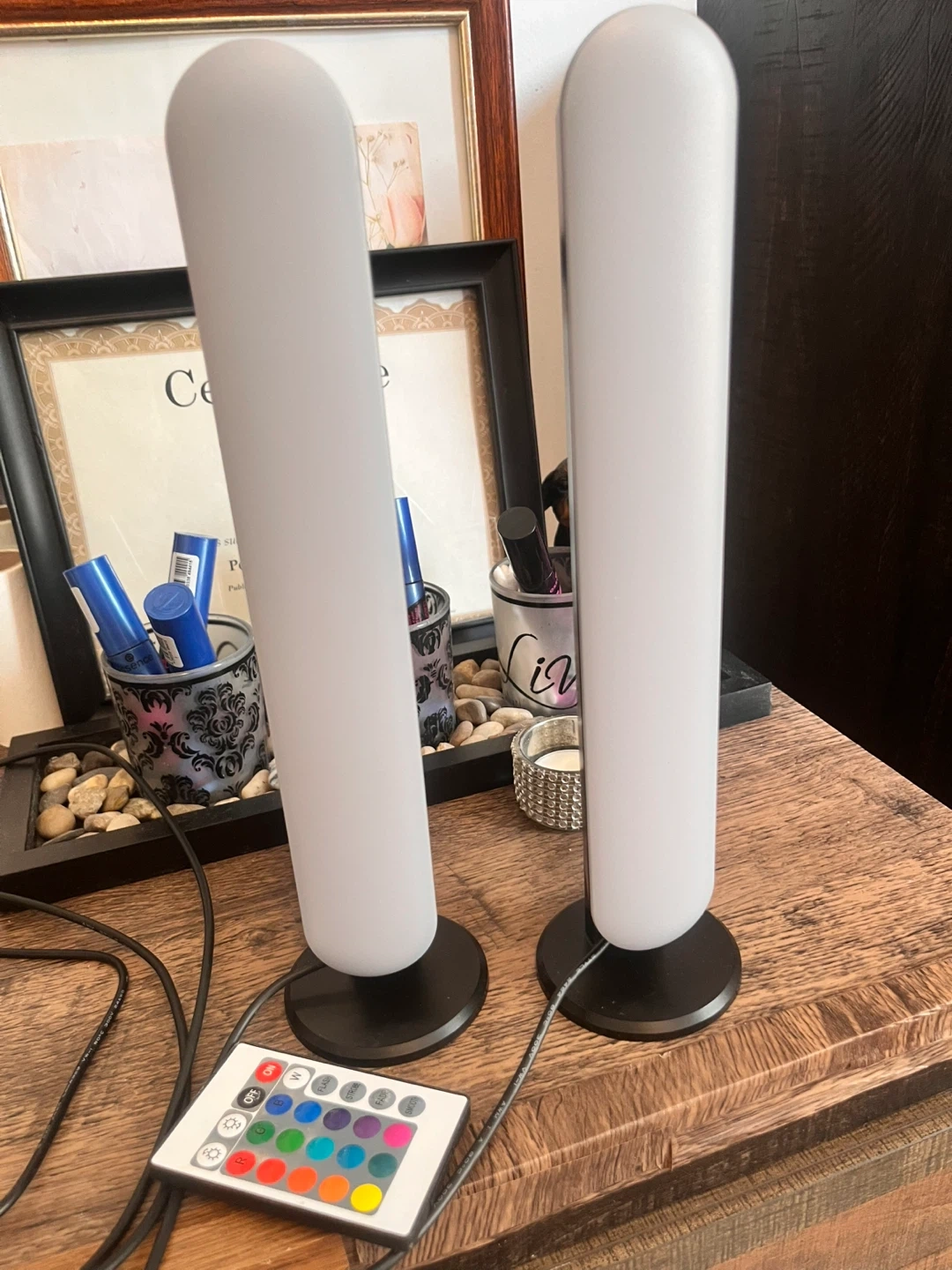 This set includes two white LED column lamps with a black base. They come with a remote control for changing colours and effects. Perfect for mood lighting!