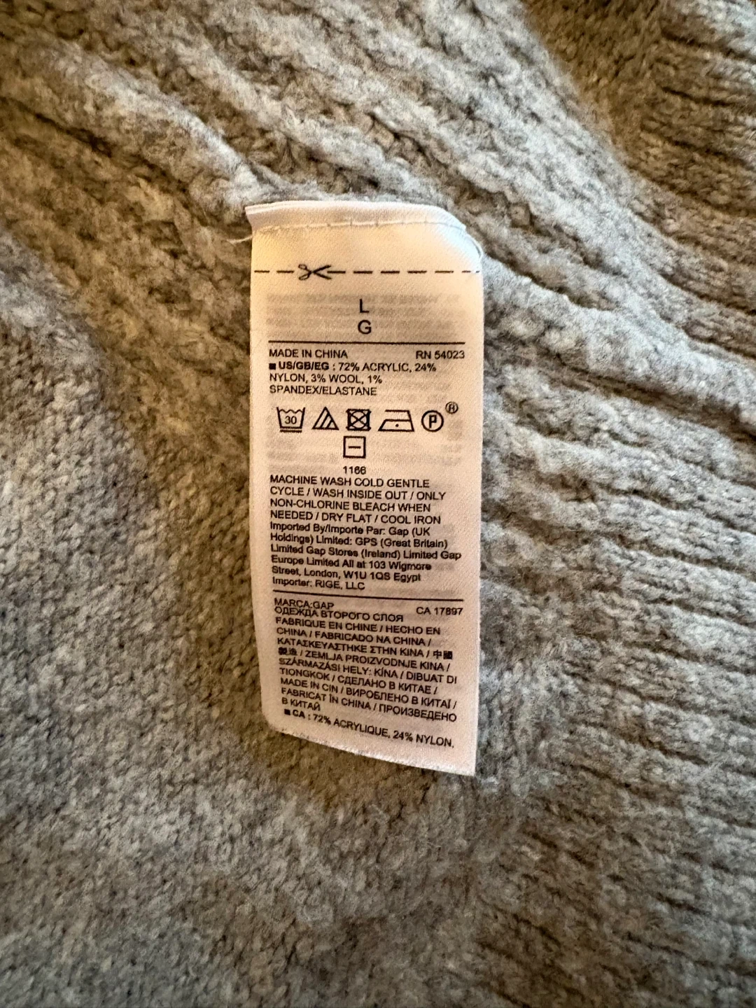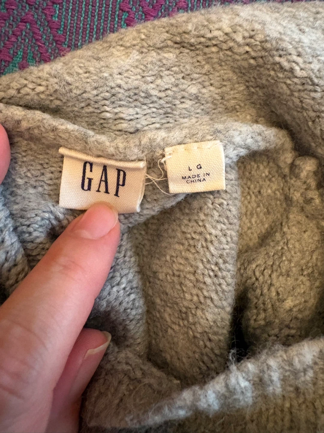 GAP turtleneck sweater in size L. Made with 72% acrylic, 24% nylon, 3% wool and 1% spandex/elastane. Care instructions: machine wash cold, gentle cycle.