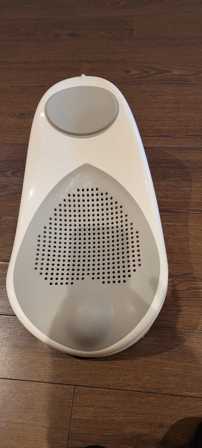 This is a white and grey Fisher-Price bath support for newborns. It's designed to help keep babies secure and comfortable during bath time. The perforated surface allows water to drain easily.