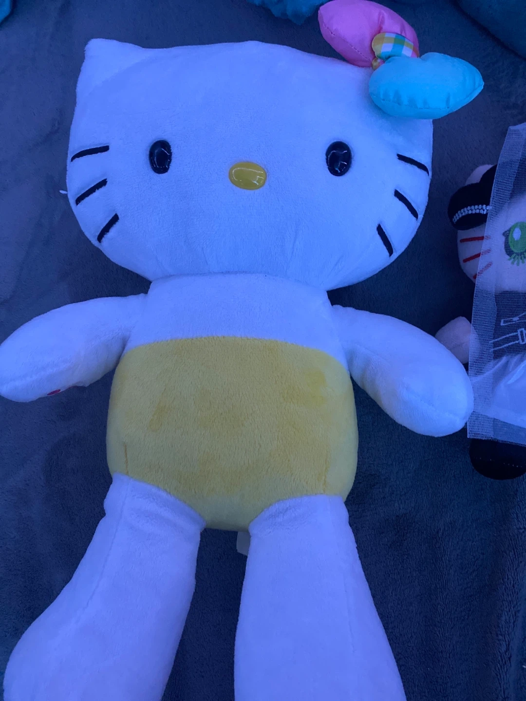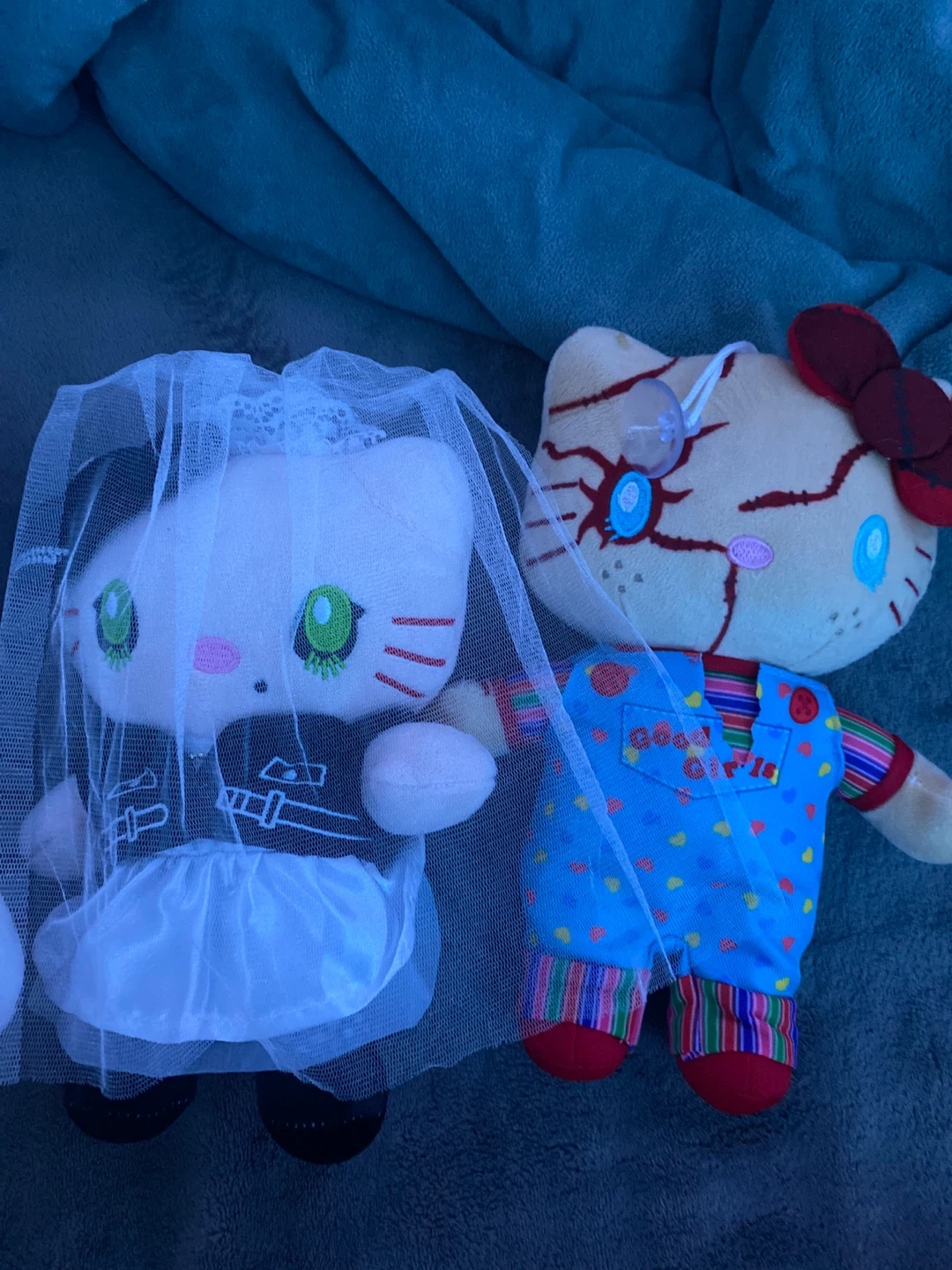 Two Hello Kitty plush toys are up for grabs. One is dressed as a bride with a veil, and the other is styled after Chucky with overalls and stitches. They're super soft and would make a fun addition to any collection!