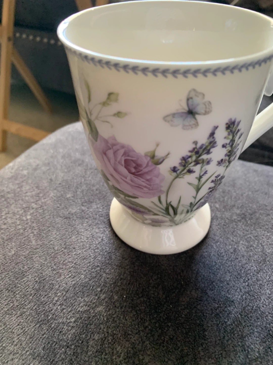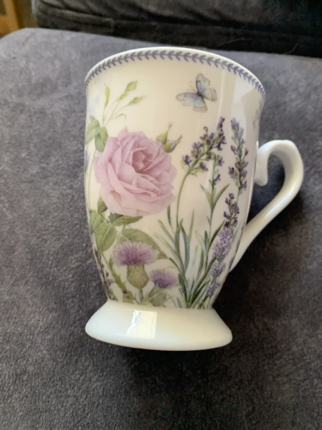 This is a lovely ceramic mug with a floral and butterfly design. It's microwave and dishwasher safe for easy use. Perfect for enjoying your morning tea or coffee!