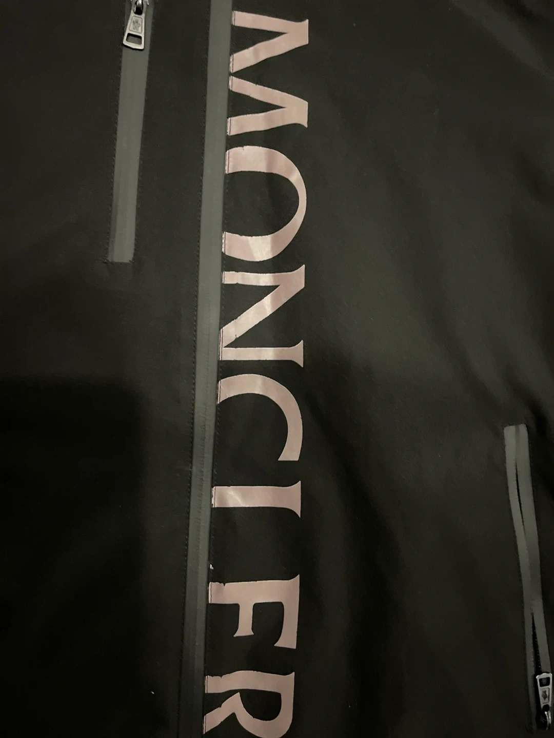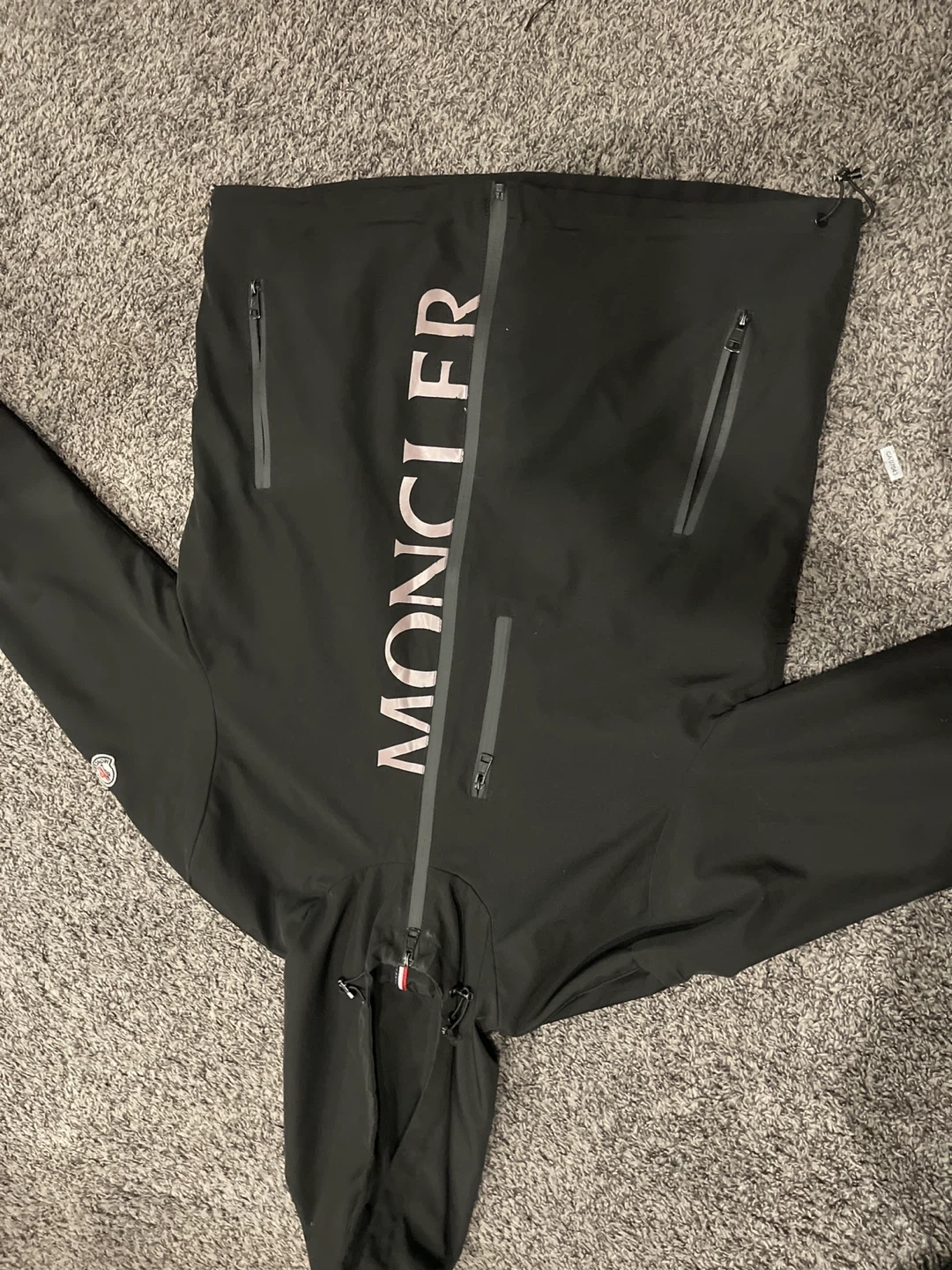 This is a black Moncler jacket with large logo detailing down the front. It features multiple zippered pockets and a full zip closure. It's perfect for layering during cooler weather.