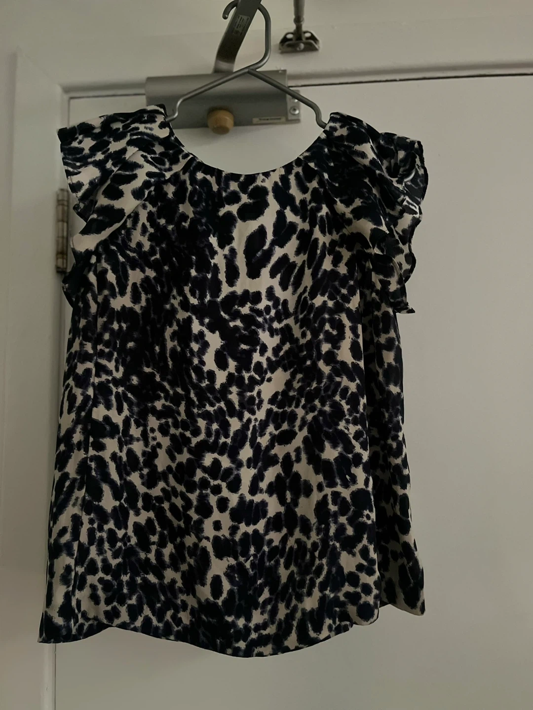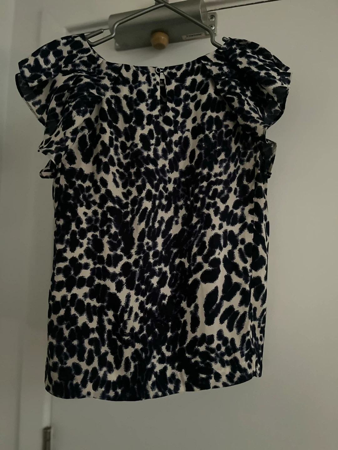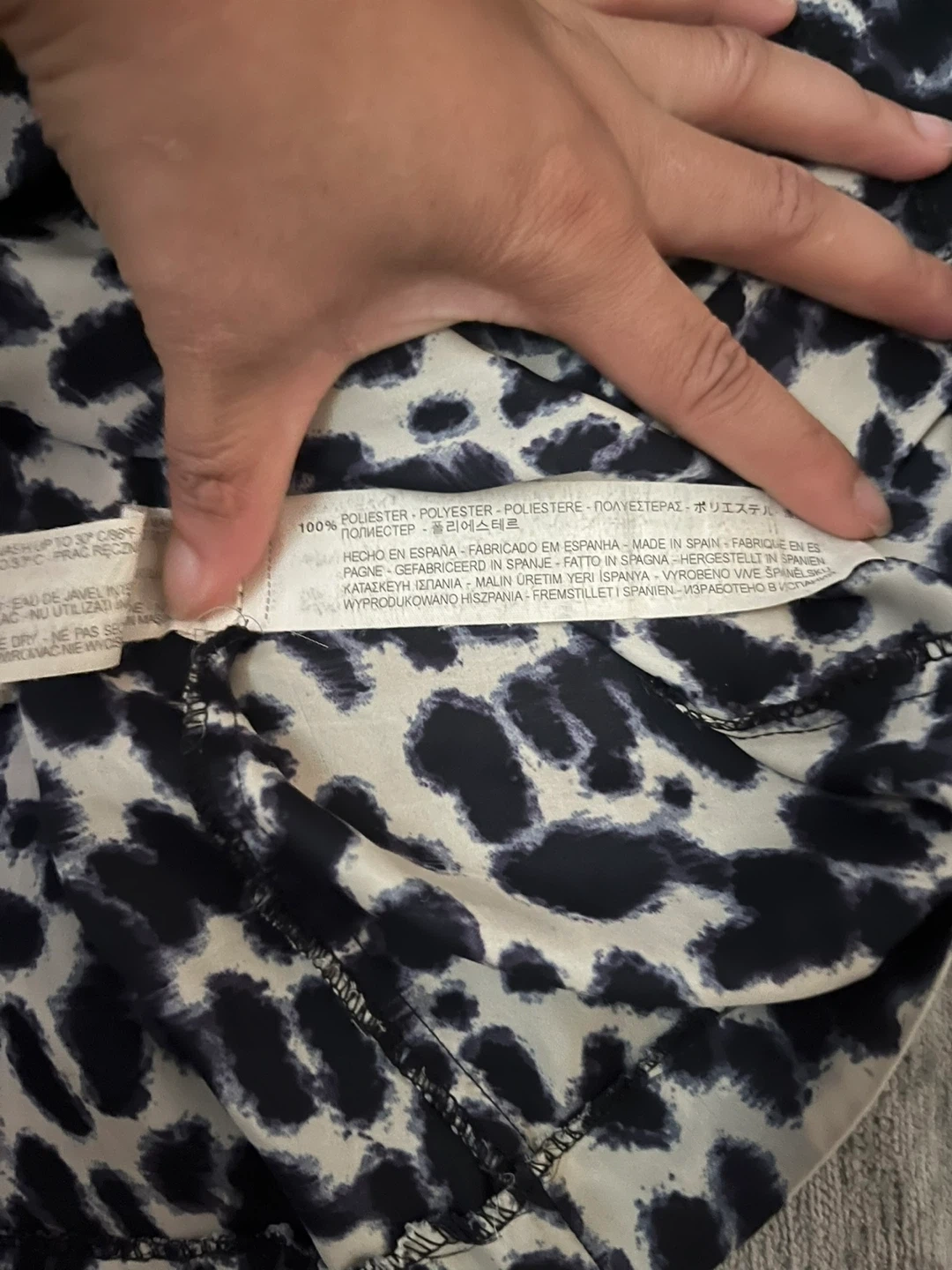 This Zara Basic blouse features a bold leopard print with ruffled sleeves. It's made of 100% polyester and was manufactured in Spain. It's perfect for adding a stylish touch to your outfit!