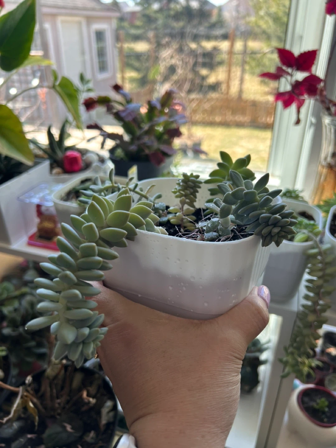 A healthy Burro's Tail succulent plant in a white pot. It's a trailing plant with unique plump leaves. Needs bright light and infrequent watering.