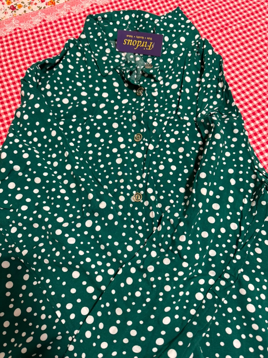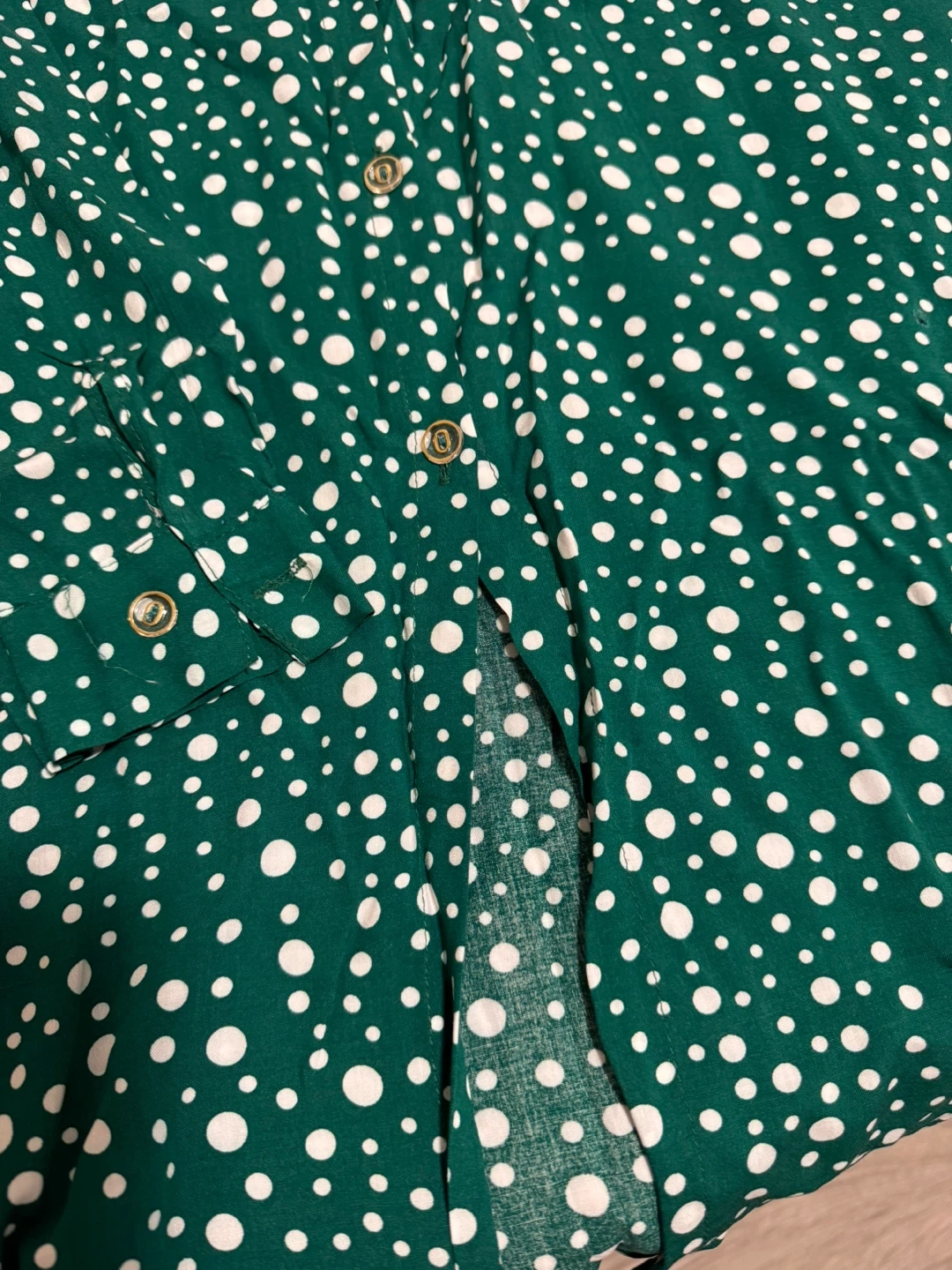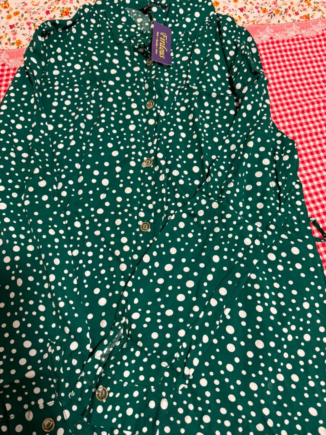 This Firdous button-up shirt is green with a white polka dot pattern. It features a classic collar and gold-toned buttons. It's a stylish piece for any casual occasion! It’s very soft and comfortable