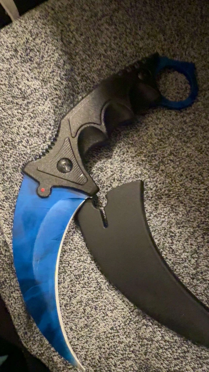 This is a karambit-style knife with a bright blue, marbled blade and a black handle. It includes a black sheath for safe storage. It's a unique piece for collectors!