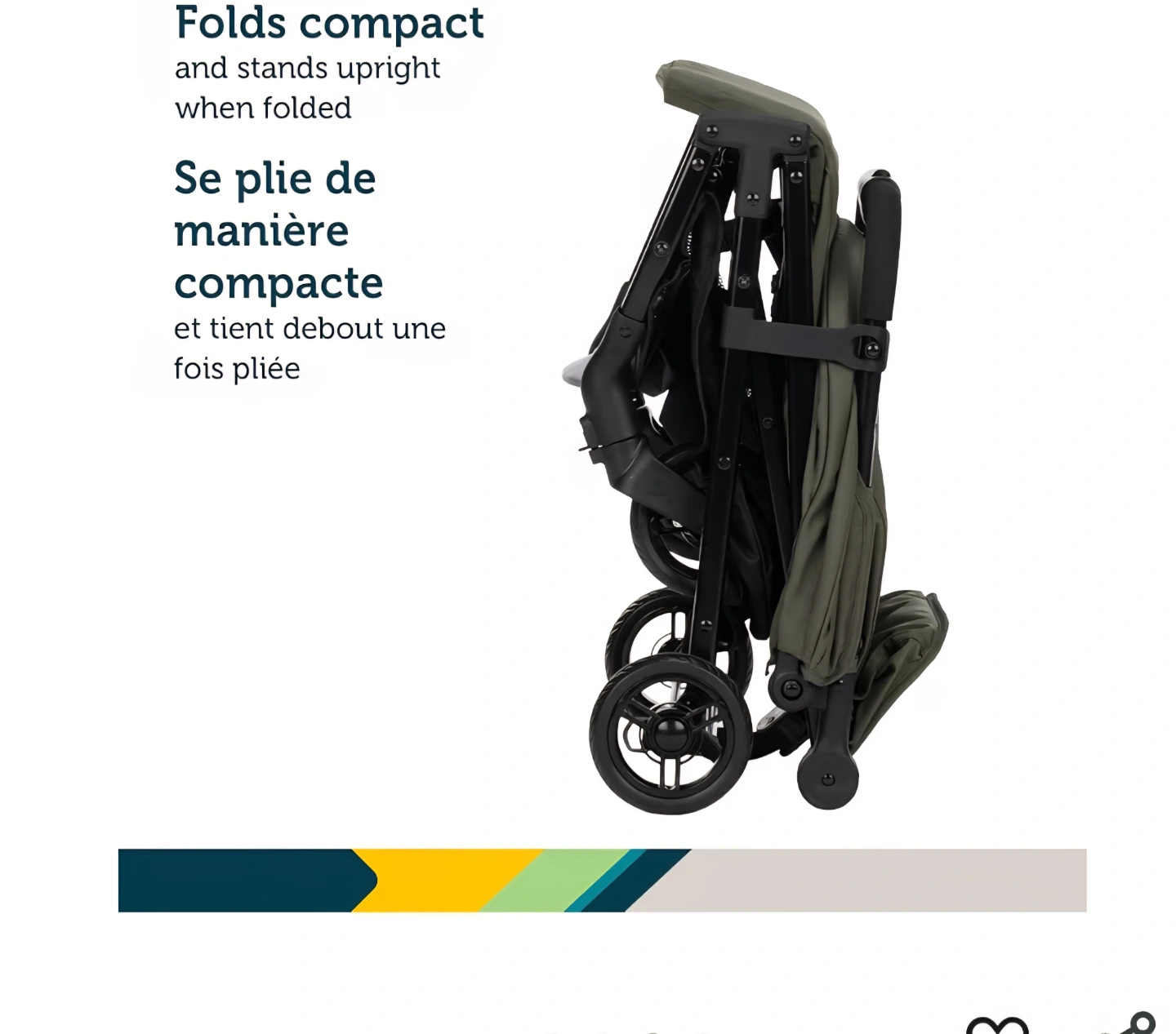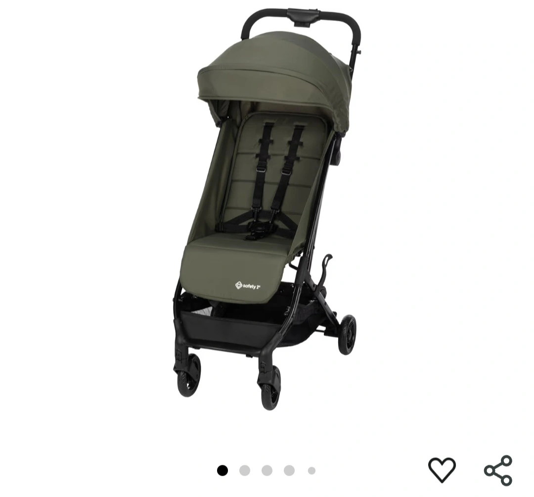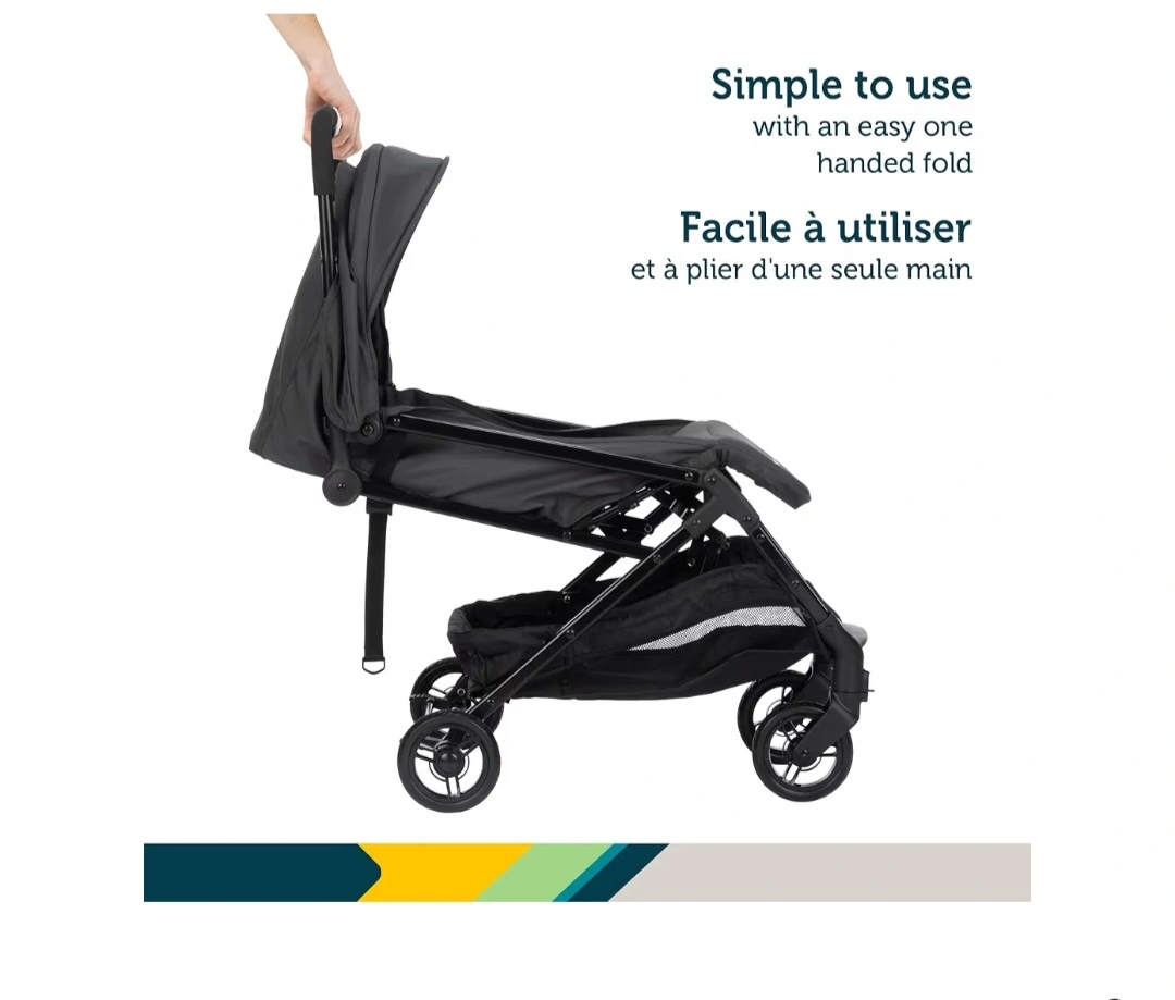 Lightweight and easy to fold stroller. One-handed fold. Compact design, stands upright when folded. Olive green colour. Great for travel.