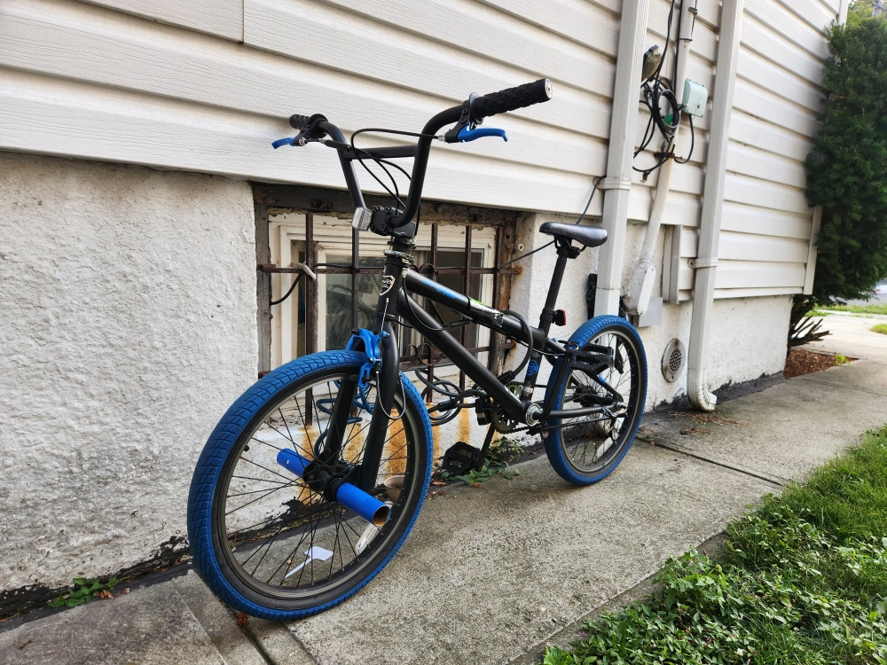 Selling a BMX bike with a black frame and cool blue accents. It's in good condition and ready to ride! Perfect for tricks or just cruising around the neighborhood