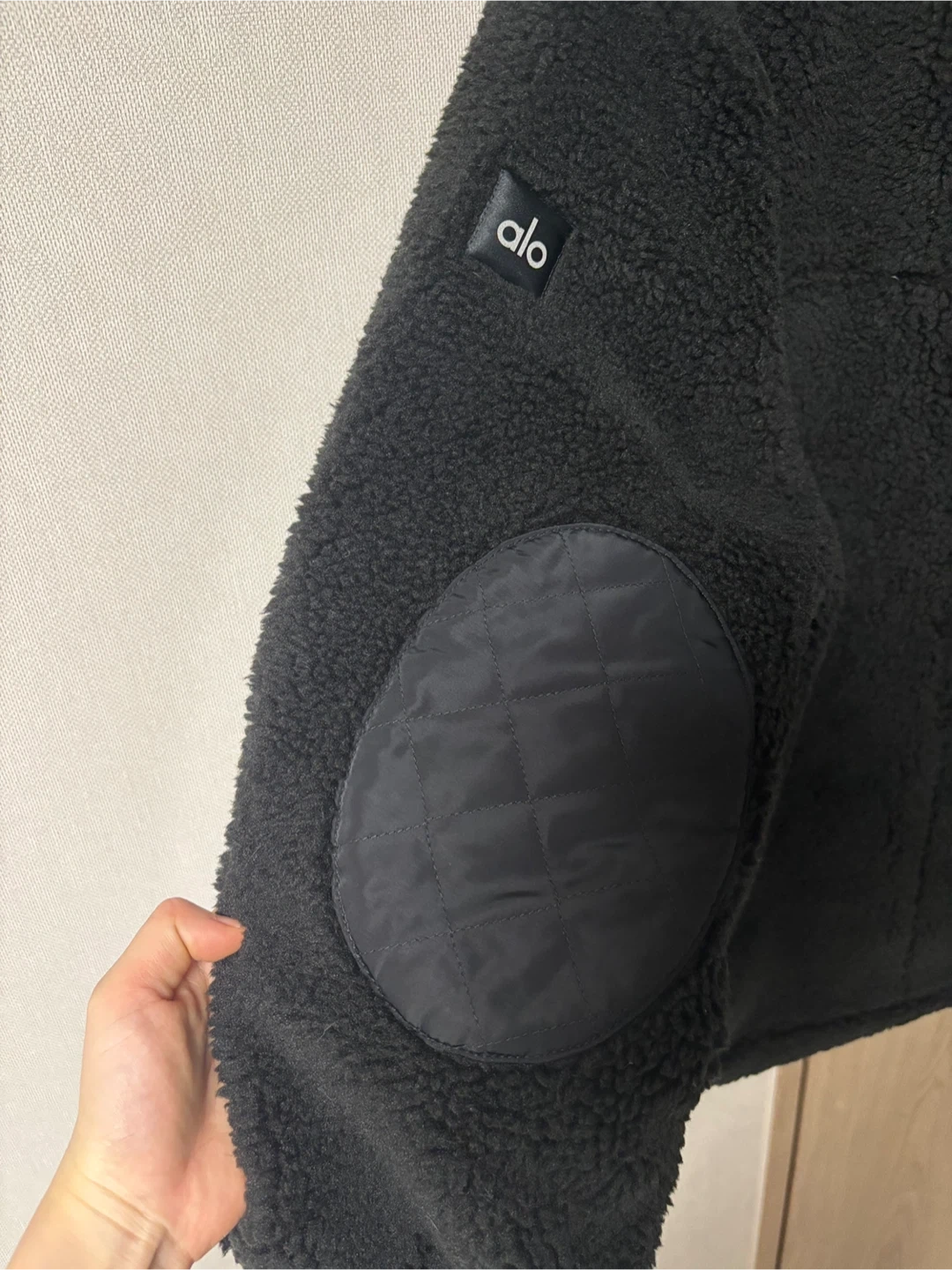 Cozy up in this stylish black sherpa jacket from ALO Yoga! It's perfect for layering on chilly days. Features include quilted detailing on the pockets and elbows. Great for adding a touch of warmth and style to your wardrobe