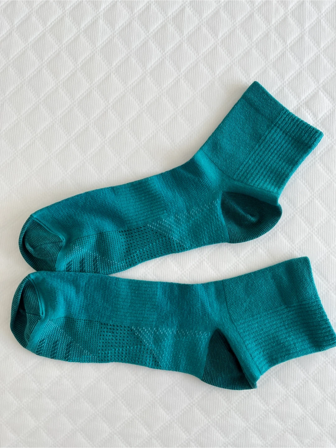 A pair of teal ankle socks. These socks have a textured pattern and breathable mesh. They're a comfortable choice for everyday wear. Size 8-9