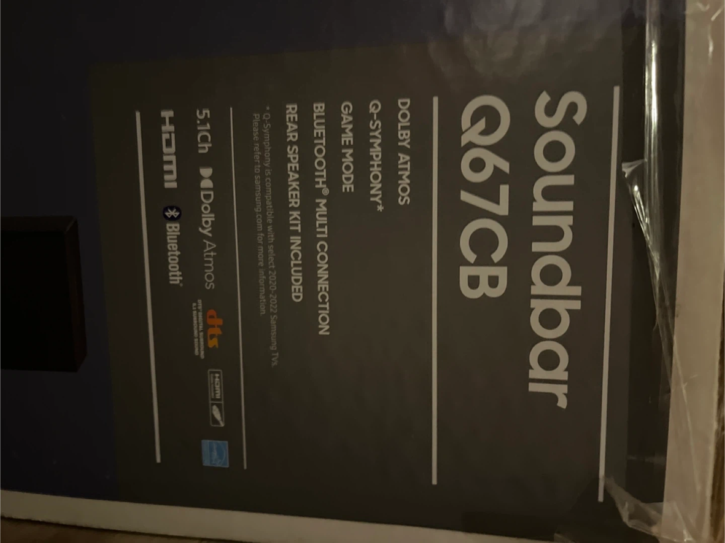Samsung Q67CB soundbar system with Dolby Atmos and Q-Symphony. It features Bluetooth multi-connection and includes a rear speaker kit. This soundbar offers immersive 3D audio for a superior sound experience. Great for gaming and movies!
