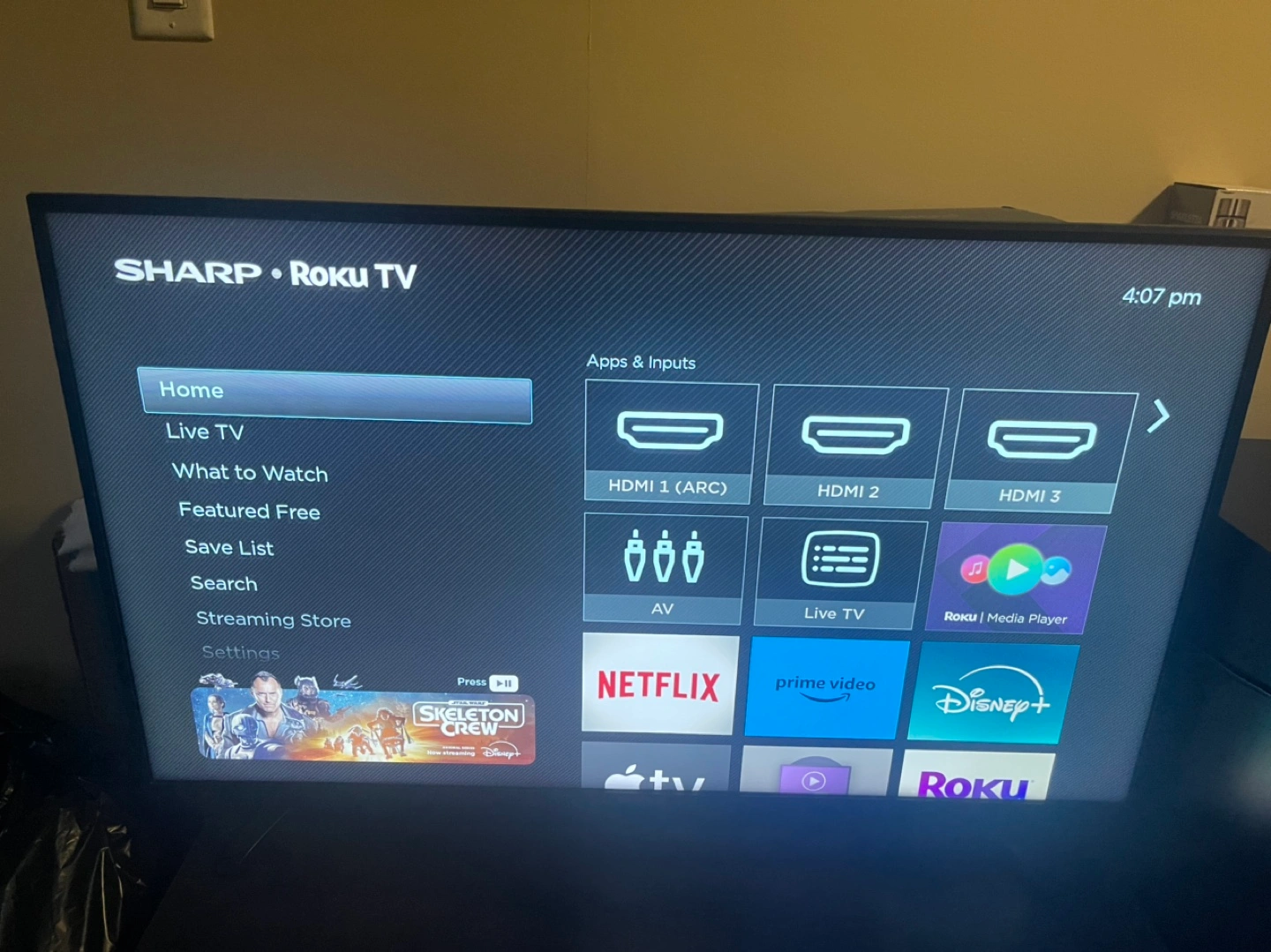 Smart TV with Roku operating system. Includes remote control. Netflix, Prime Video, Disney Plus and other apps included.
