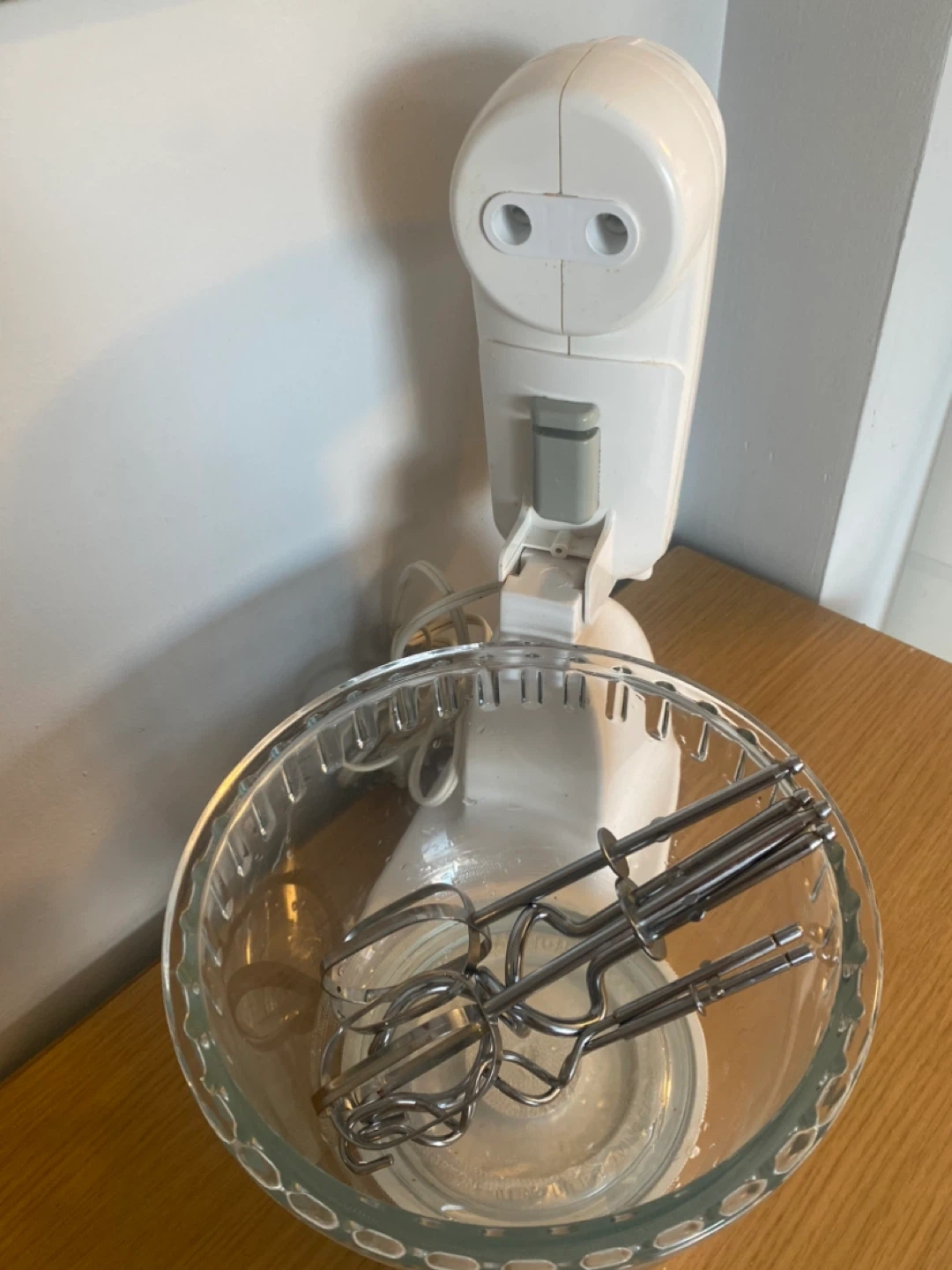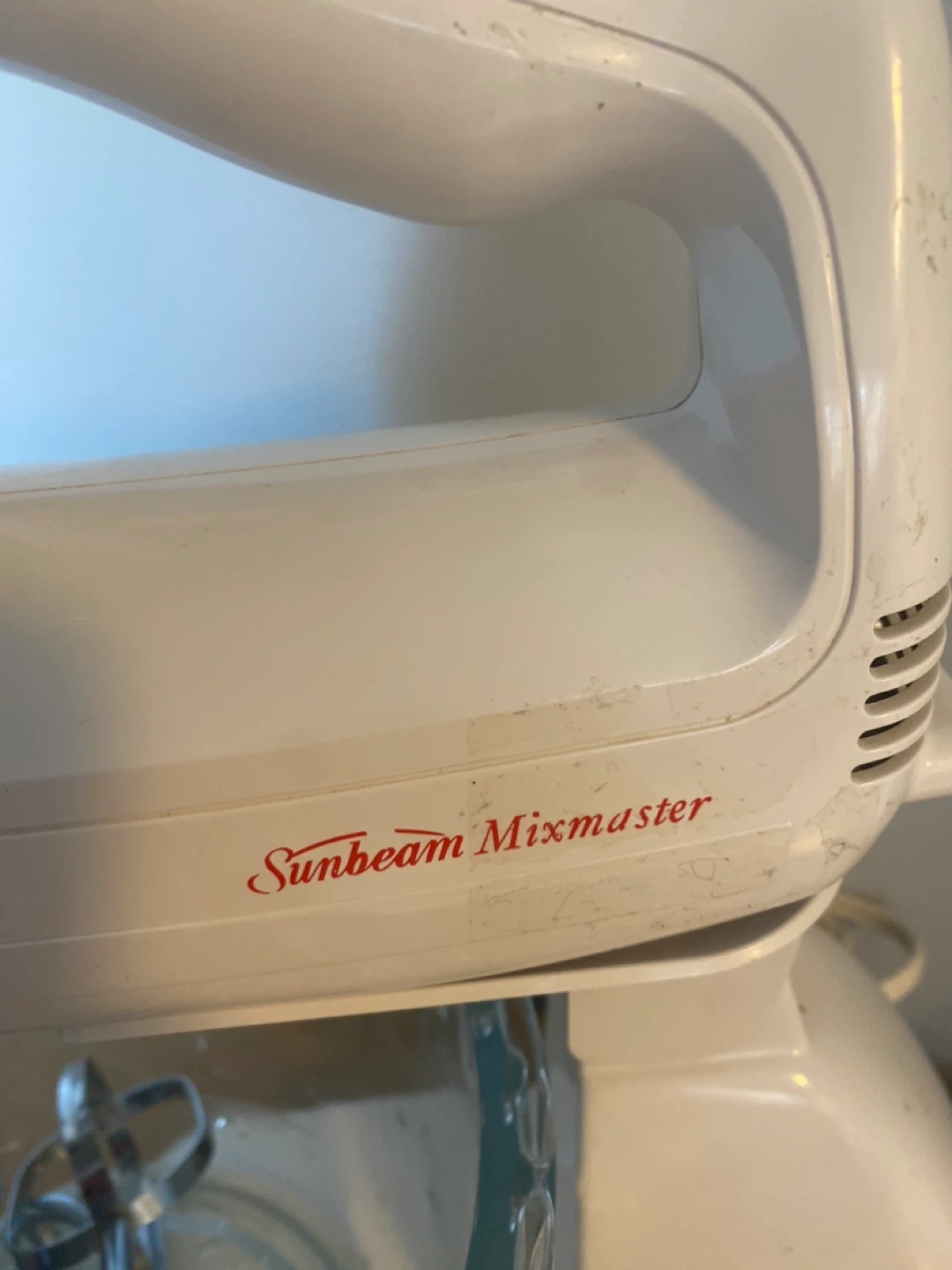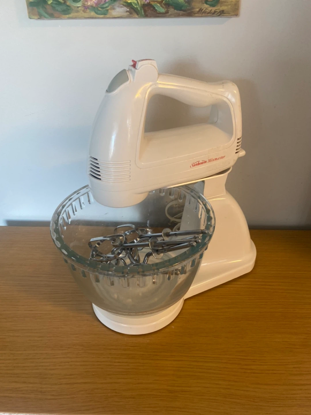 This is a white Sunbeam Mixmaster hand mixer. It comes with a clear glass bowl and multiple attachments for mixing. It's a classic kitchen appliance.
