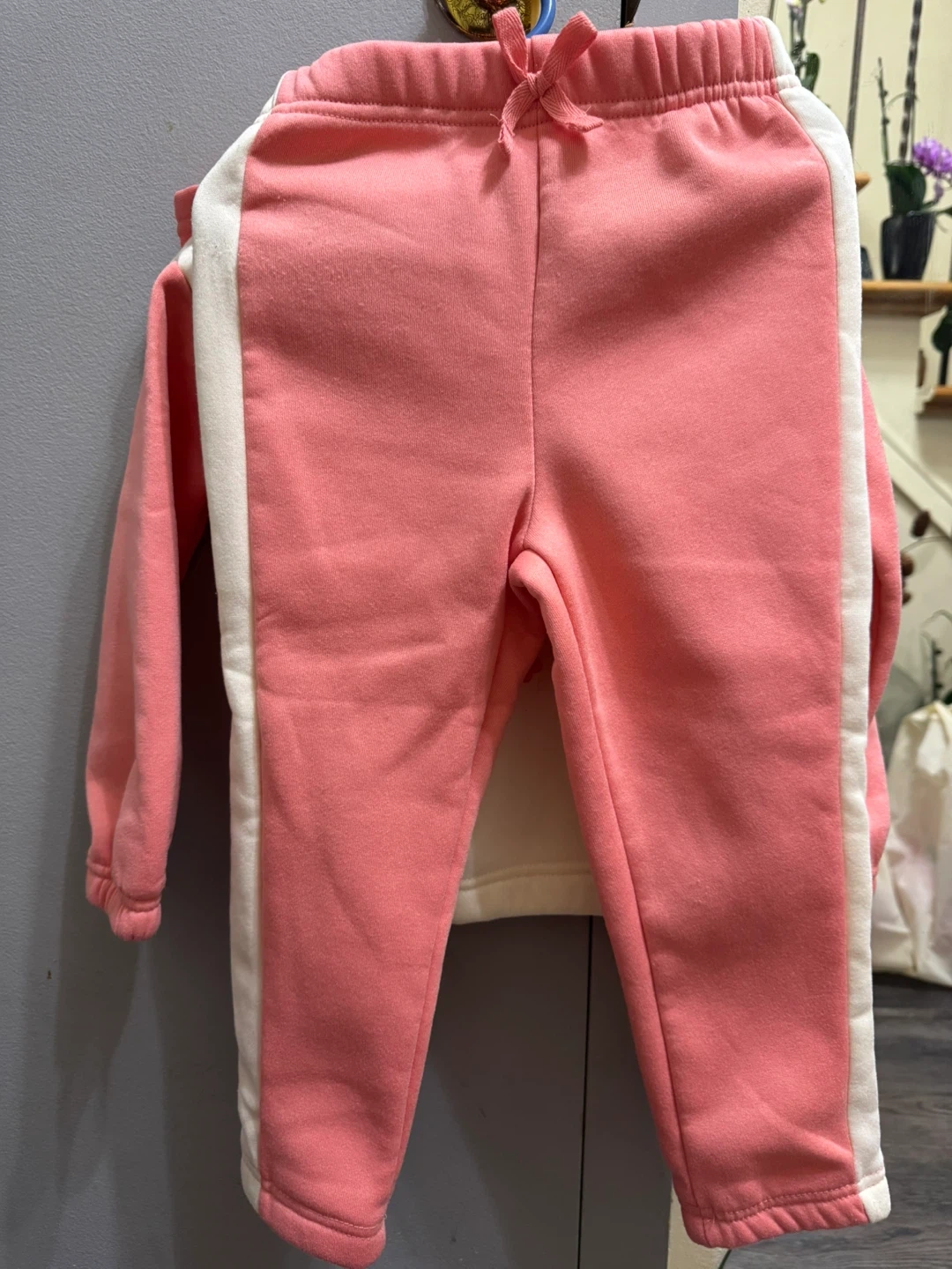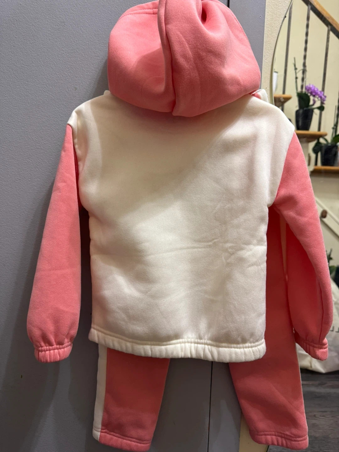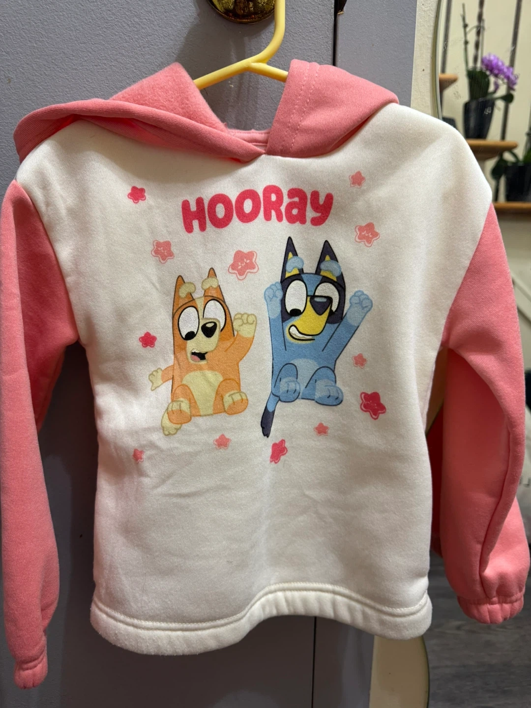This adorable Bluey hoodie and pants set is perfect for any little fan! It features the beloved characters Bandit and Bingo on the hoodie with a "Hooray!" graphic. The set includes a pink and white hoodie with contrasting side stripes on the matching pink pants. Made from comfortable material, this set is ideal for playtime.