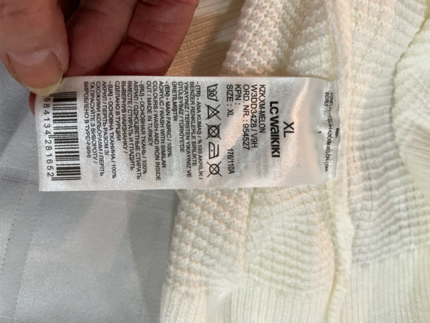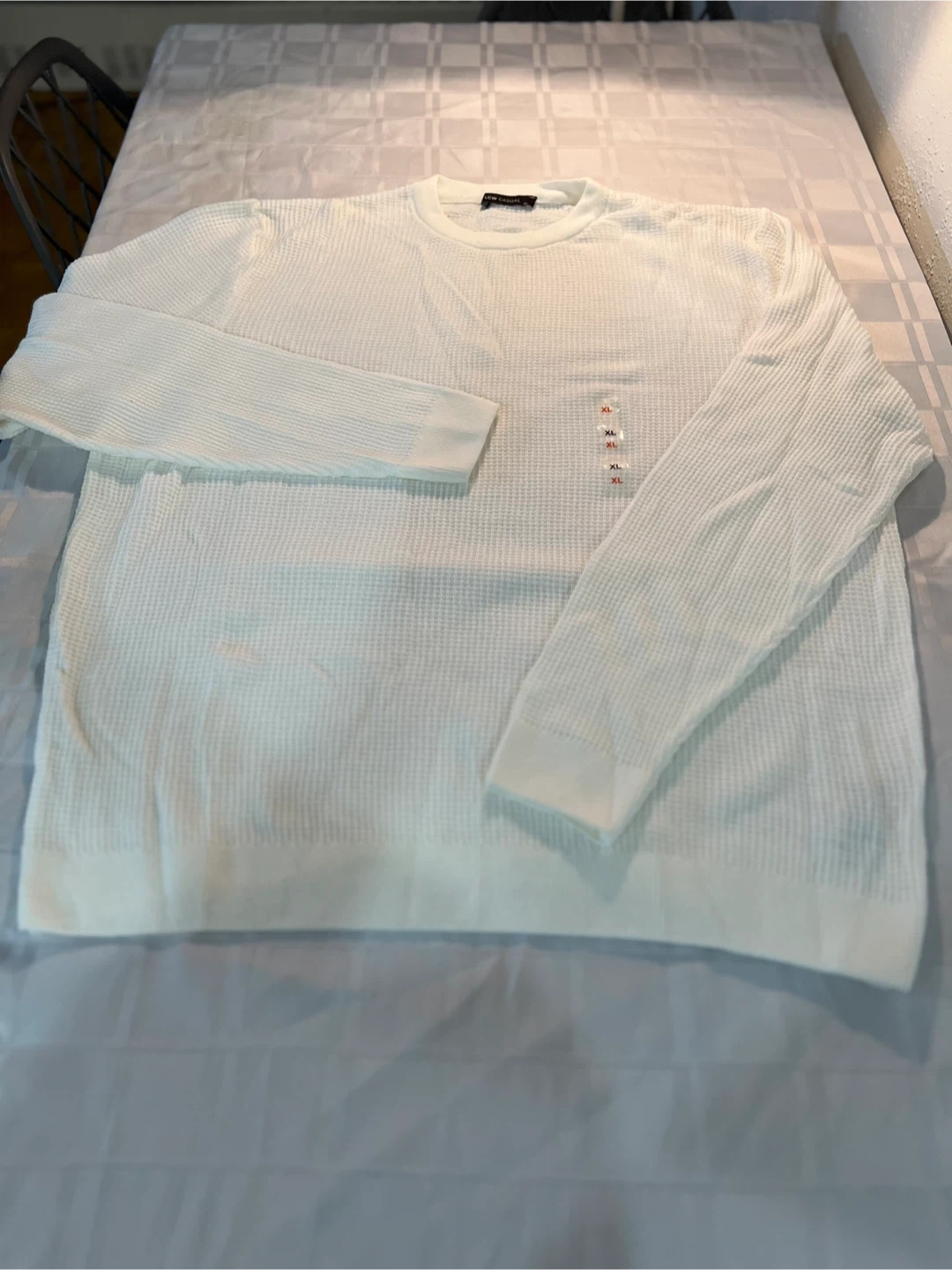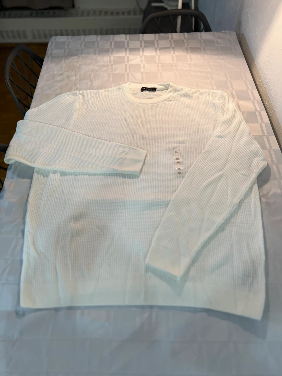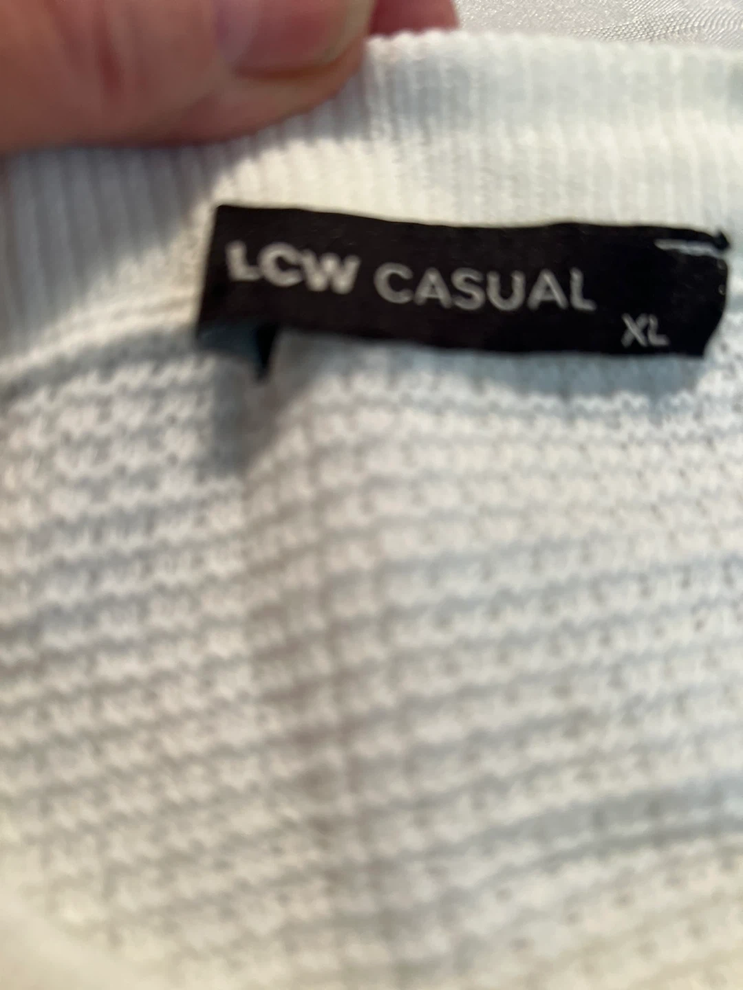 Here's a comfy long-sleeve shirt from LCW Casual! It's a size XL and comes in white. The tag says it's made in Turkey and is 100% acrylic. It's in great condition and ready for a new wardrobe