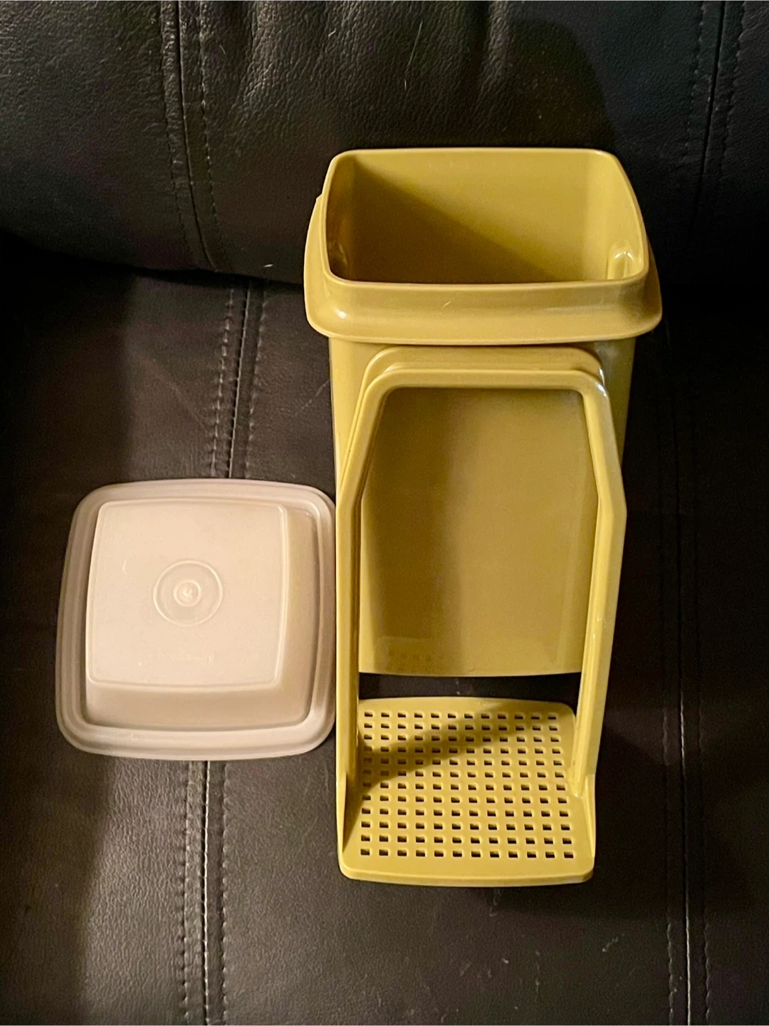 This vintage Pick-a-Deli Tupperware container comes with a handy strainer insert and lid. It's a versatile kitchen tool, perfect for draining or storing food. Made in Canada. Excellent condition. Avocado green.