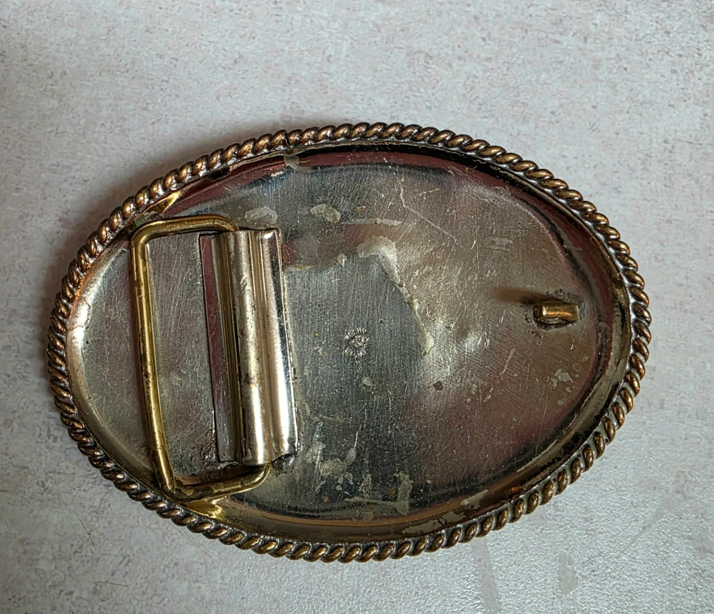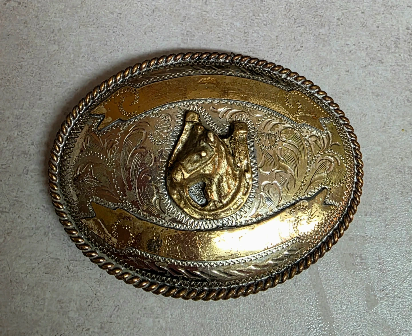 This is an oval western-style belt buckle featuring a horseshoe and floral engraving. It has a rope-style border and a two-tone gold and silver finish. Buckle suitable for standard belts.