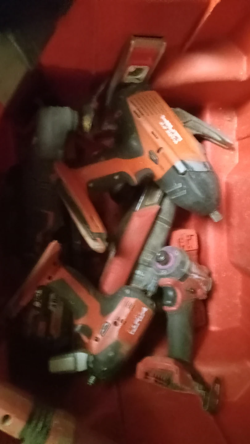 A collection of assorted power tools including a reciprocating saw, a nail gun, and other accessories. Tools appear to be from brands like Milwaukee, Hilti, and Some items may have batteries and chargers included.