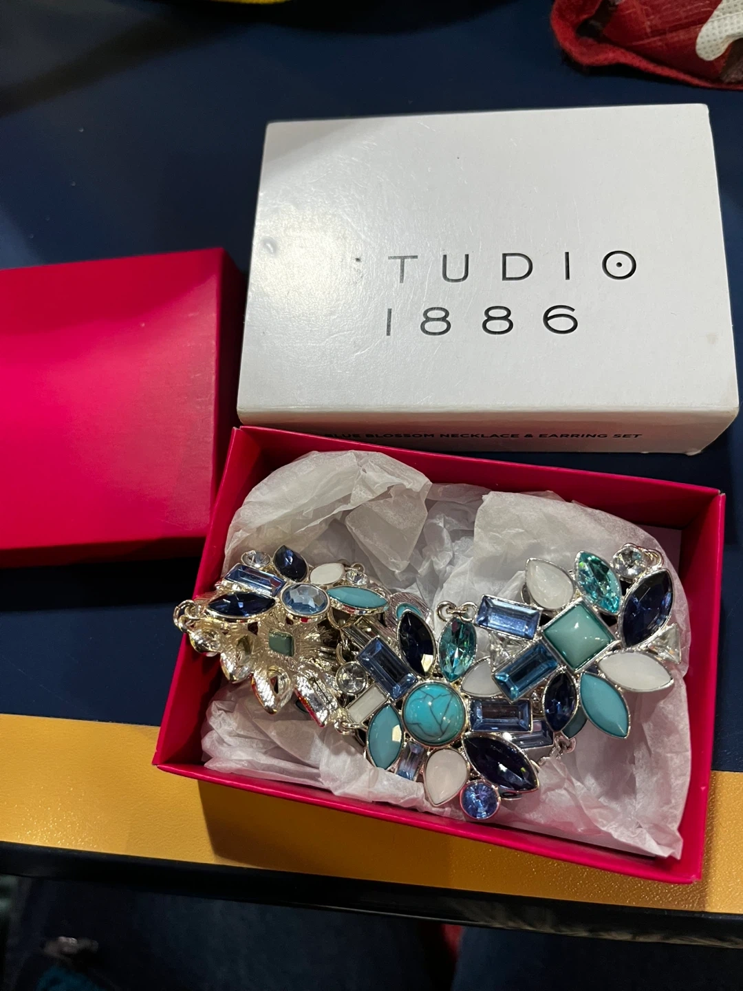 This Studio 1886 blue blossom necklace and earring set comes with the original box. It features a statement necklace with a variety of blue and white stones. Perfect for adding a pop of colour to any outfit!
