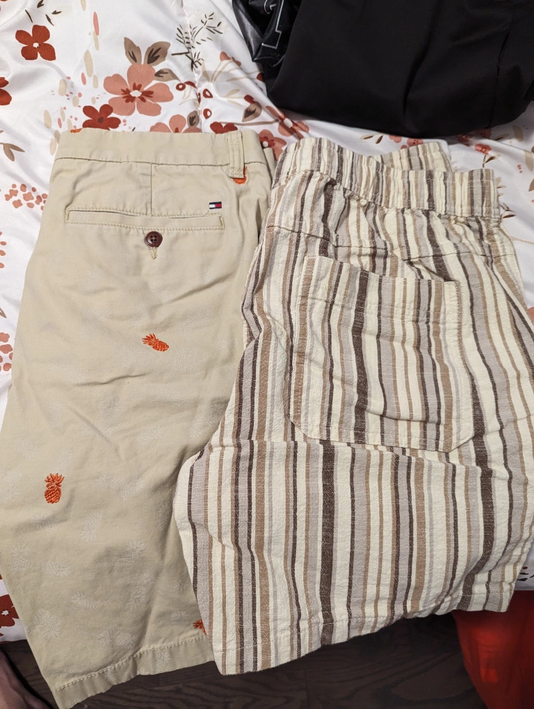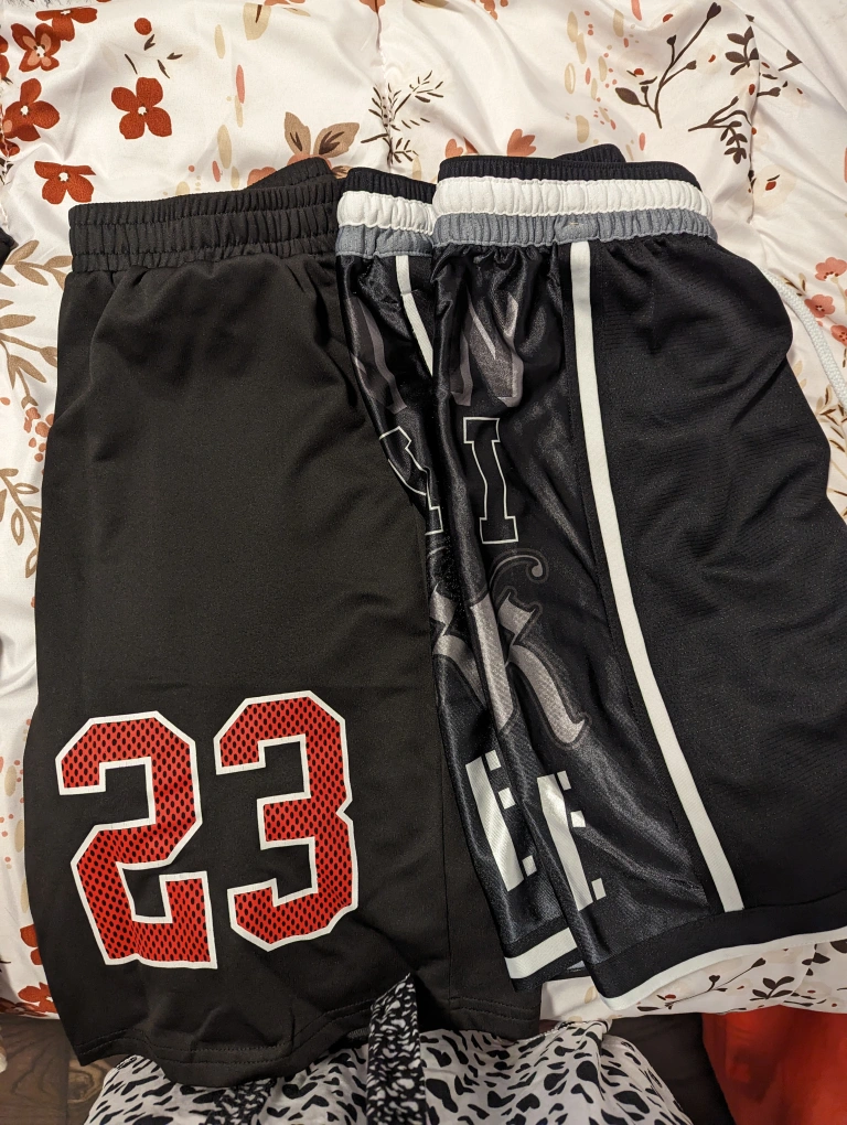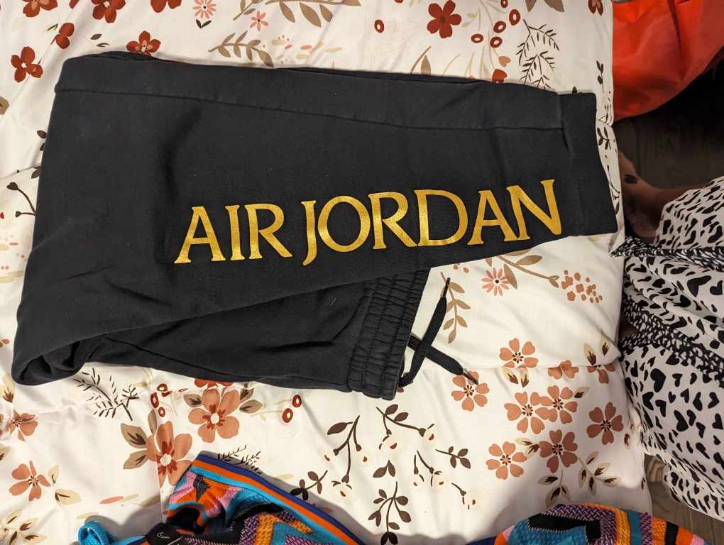 Black sweatpants with gold Air Jordan logo, size M. Nike shorts , tommy Hilfiger shorts, Nike hooded sweater with sequin basketball.