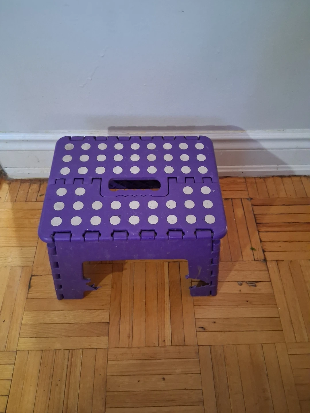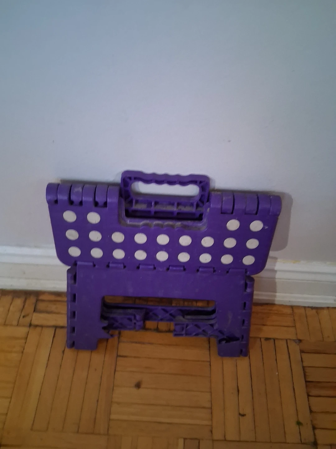This is a compact purple folding step stool. It's made of plastic and has a portable design. Useful for reaching high places around the house!