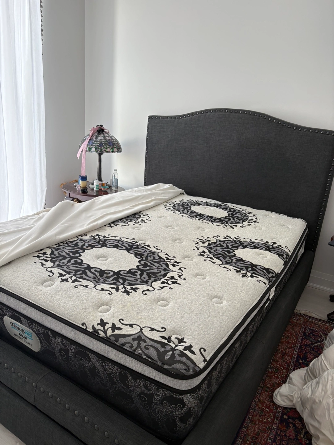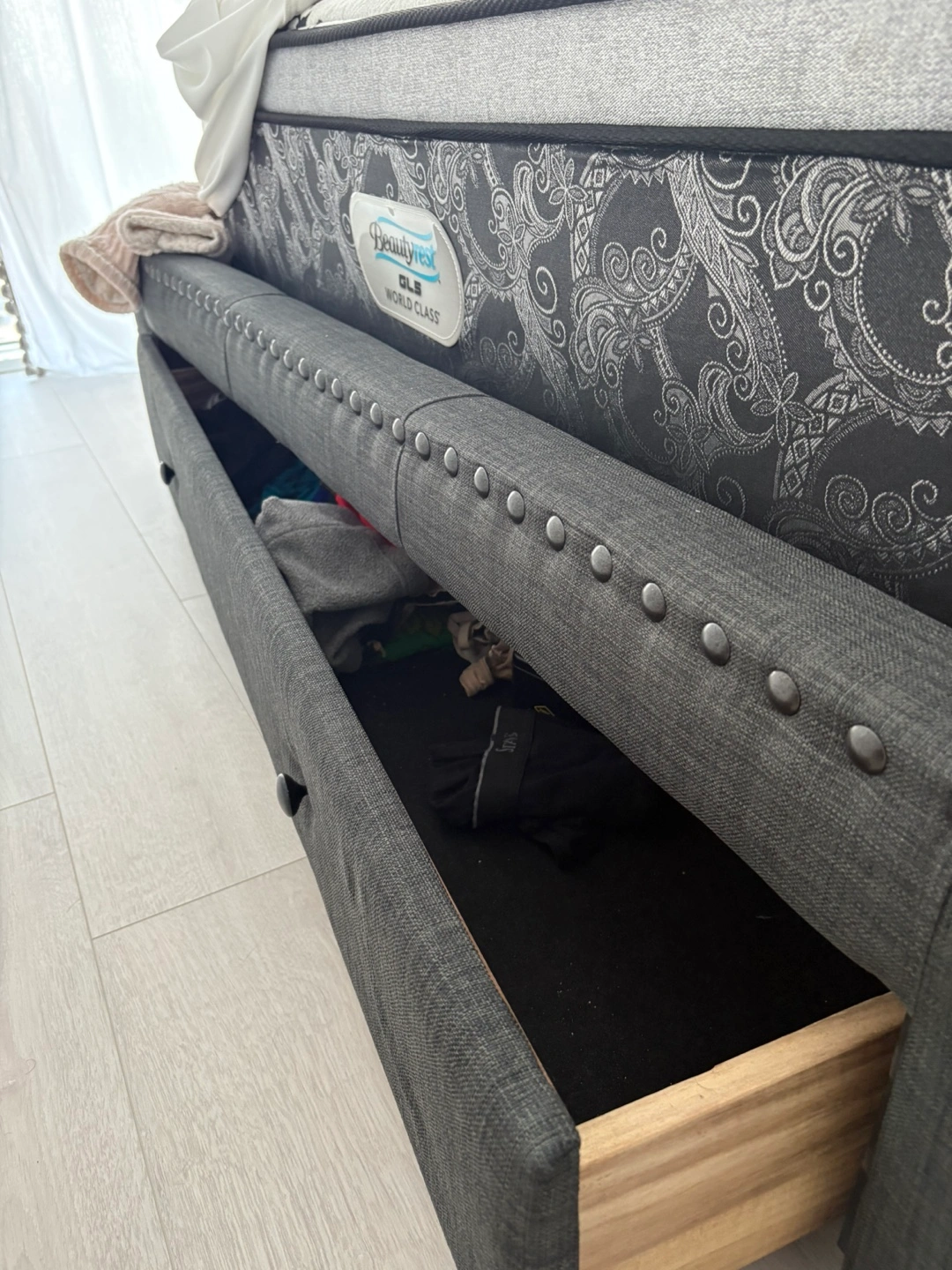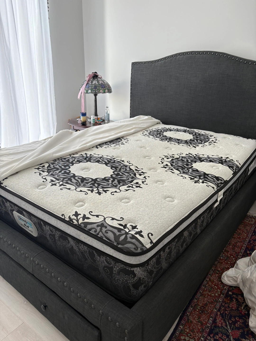Queen-size mattress and bed frame. Dark grey fabric headboard with button tufting and storage drawers. Elegant pattern on mattress. Used but in good condition.