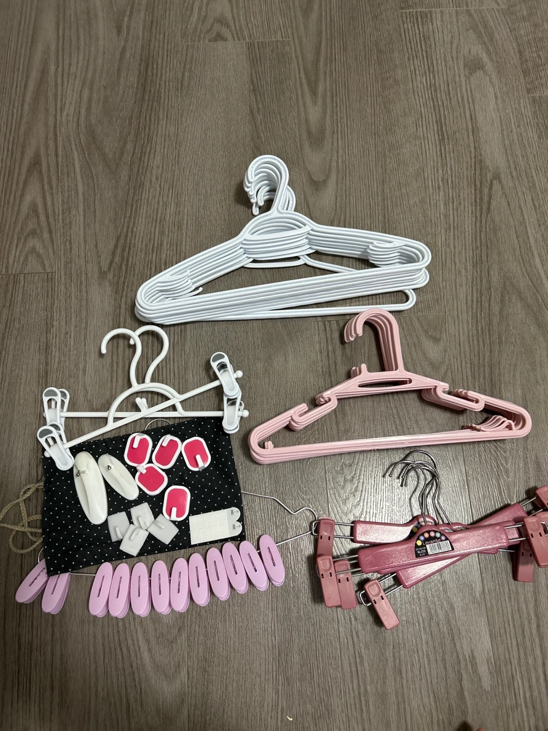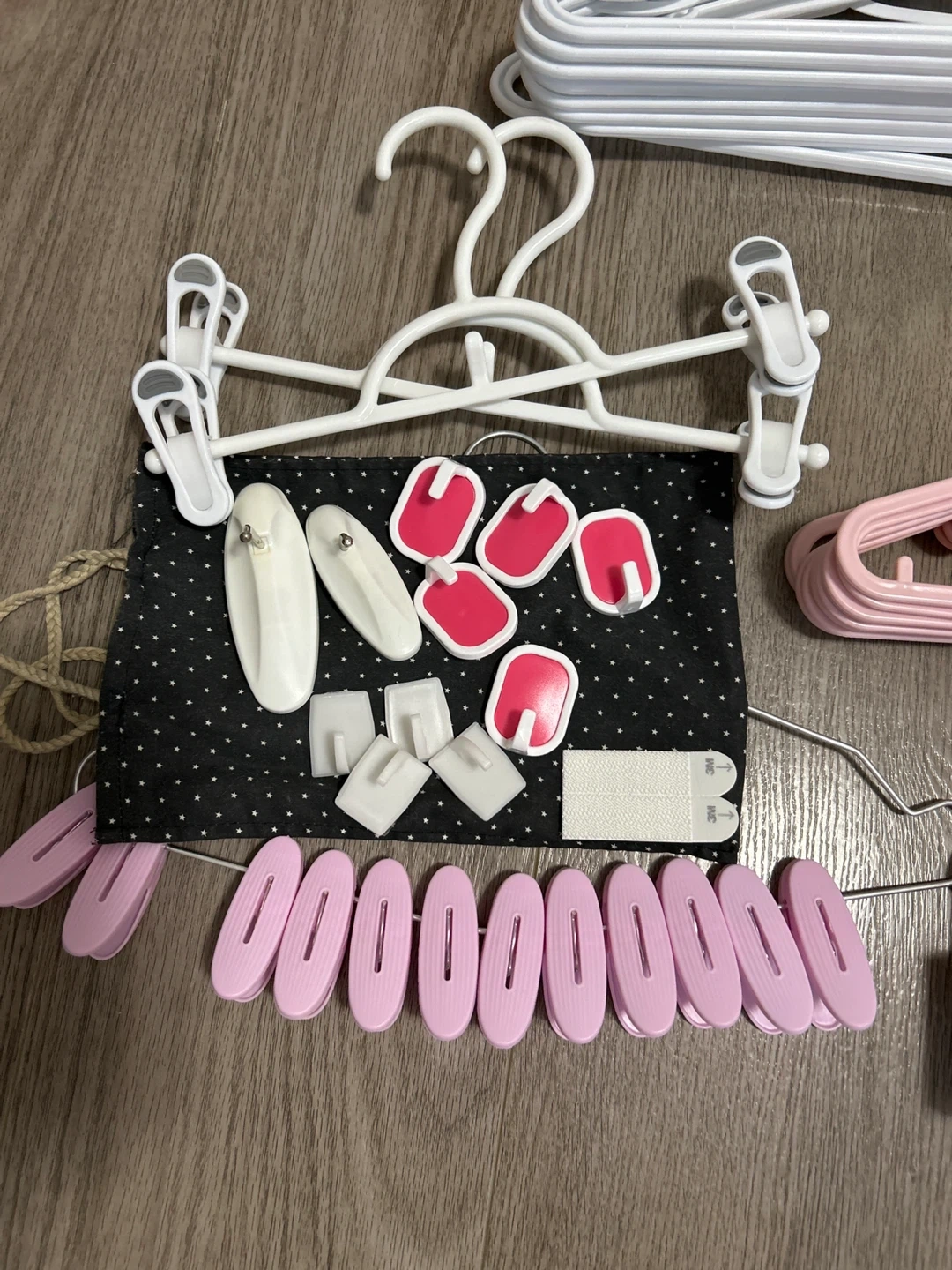 An assorted white adhesive hooks, pink clothespins, and 3M Command strips.