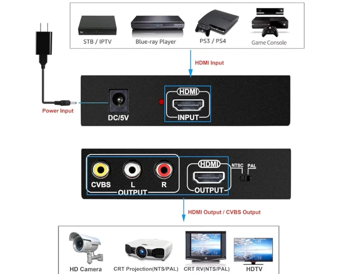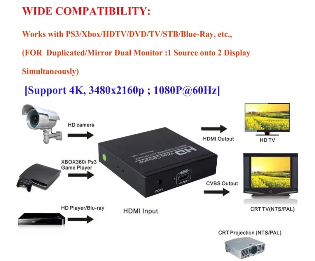 One Input To Two Output - This HD Video Converter can distribute 1 HDMI input signal to HDMI Output + CVBS composite video signal and L/R stereo audio Output , transmit video and audio simultaneously, no loss, no lag .(Come with a 5V1A Power adapter, please always connect the power adapter during application).