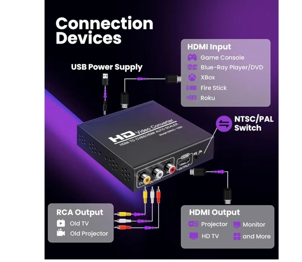 PLUG&PLAY - Built-in IC chip, the HDMI to HDMI + RCA/AV converter box Converts digital signals to composite analog signals,No need Install driver. With brand new and strong Metal shell, Nice appearance and has a good heat dissipation.