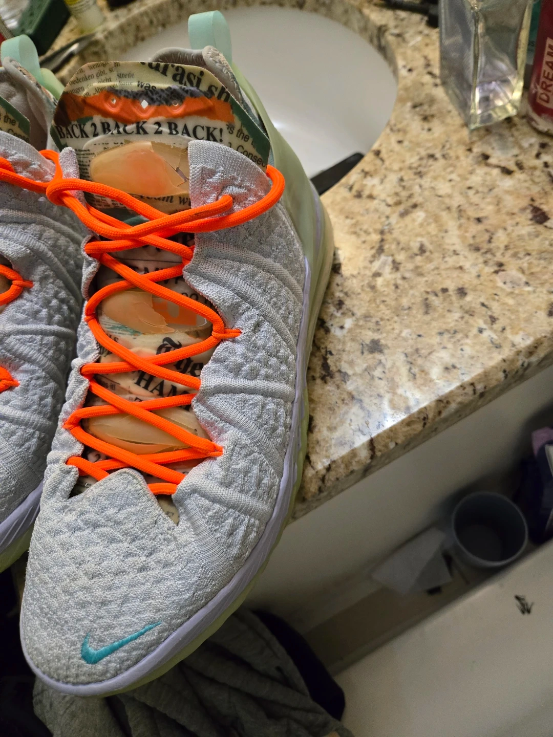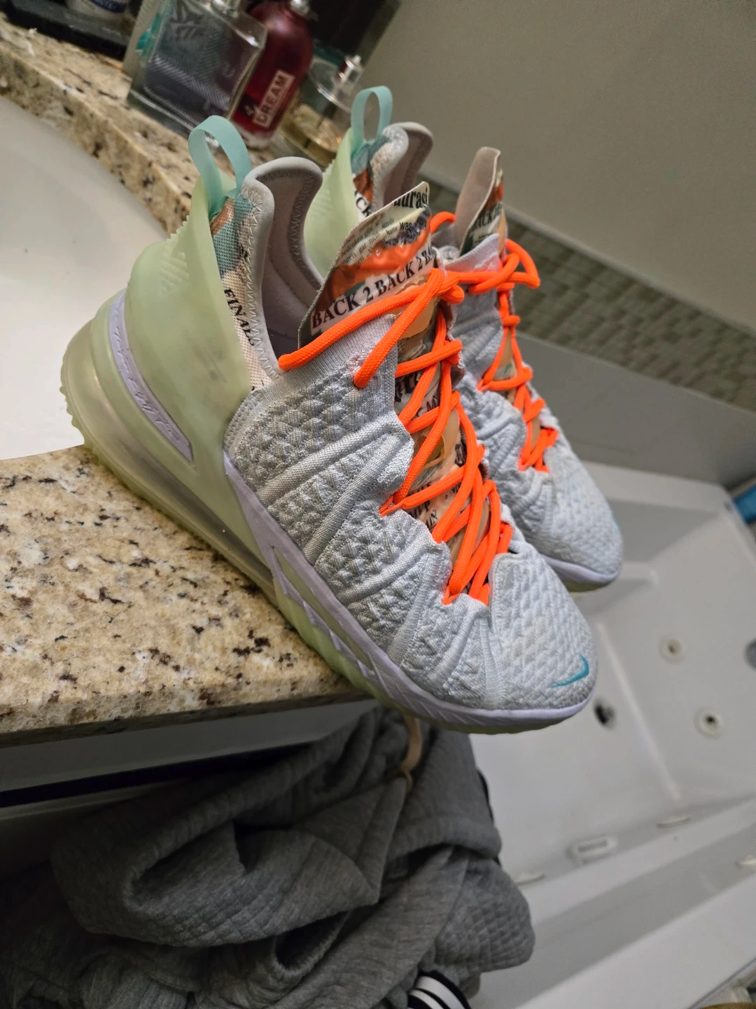 These Nike LeBron 18 Low sneakers feature a white and grey knit upper with bright orange laces. The outsole has a light purple and green accent. They're super comfortable and stylish for everyday wear! Size 10-11