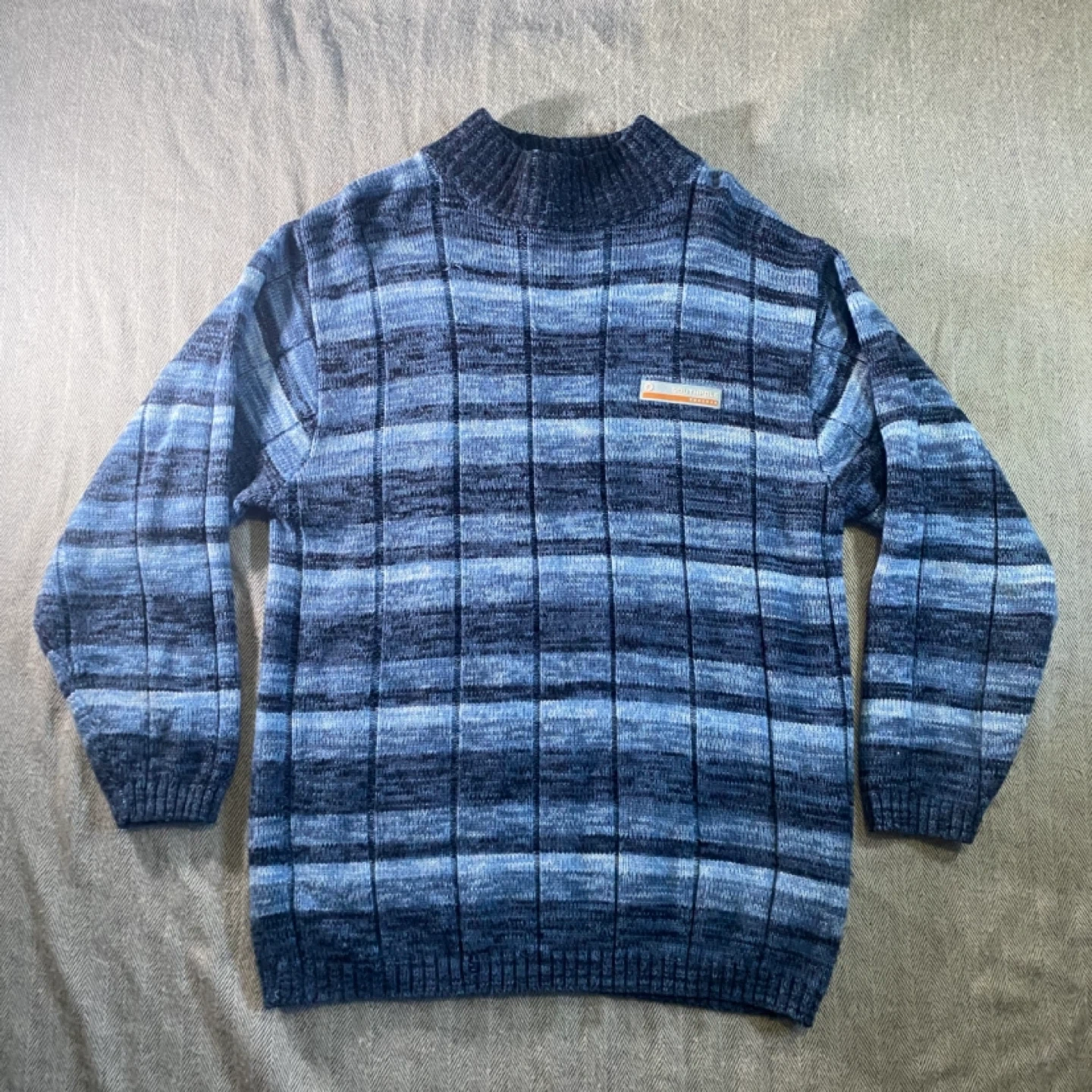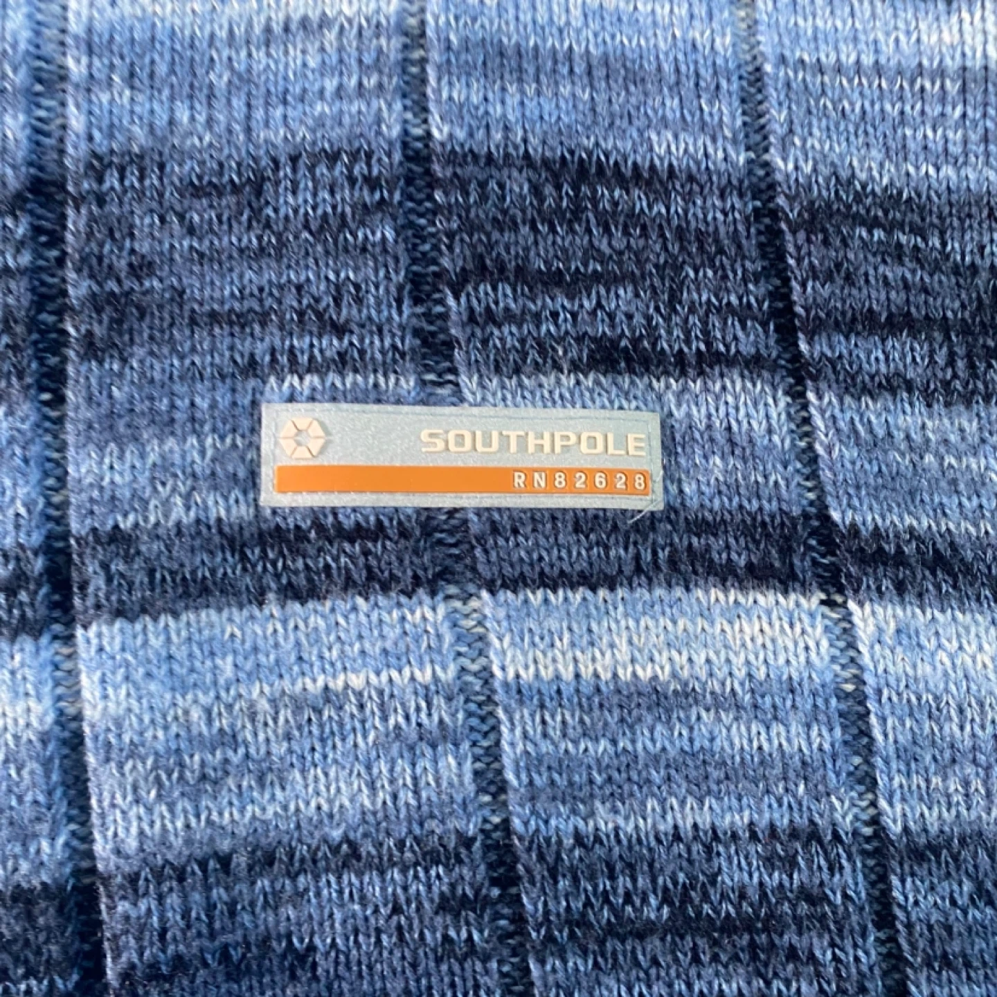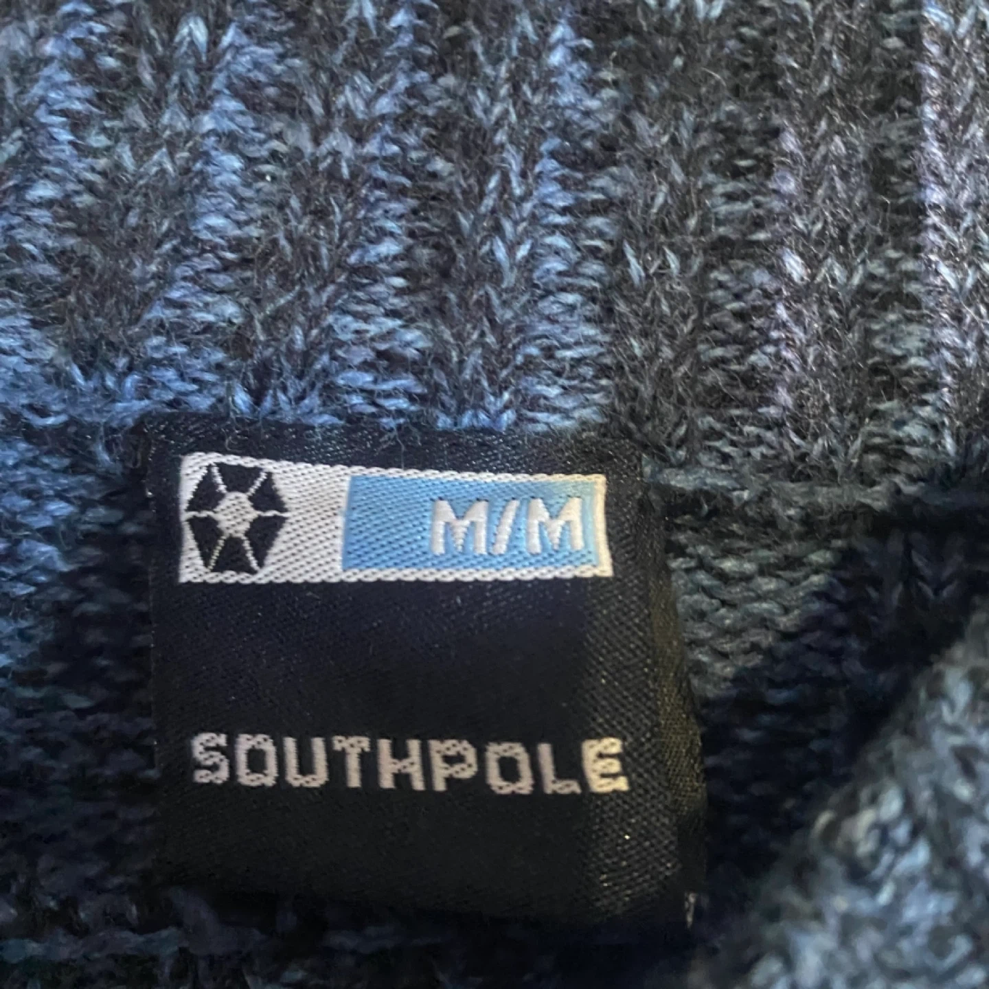 Vintage Southpole men's sweater in a blue striped pattern. It's a size medium and made from a knit material. This pullover is great for cooler weather!