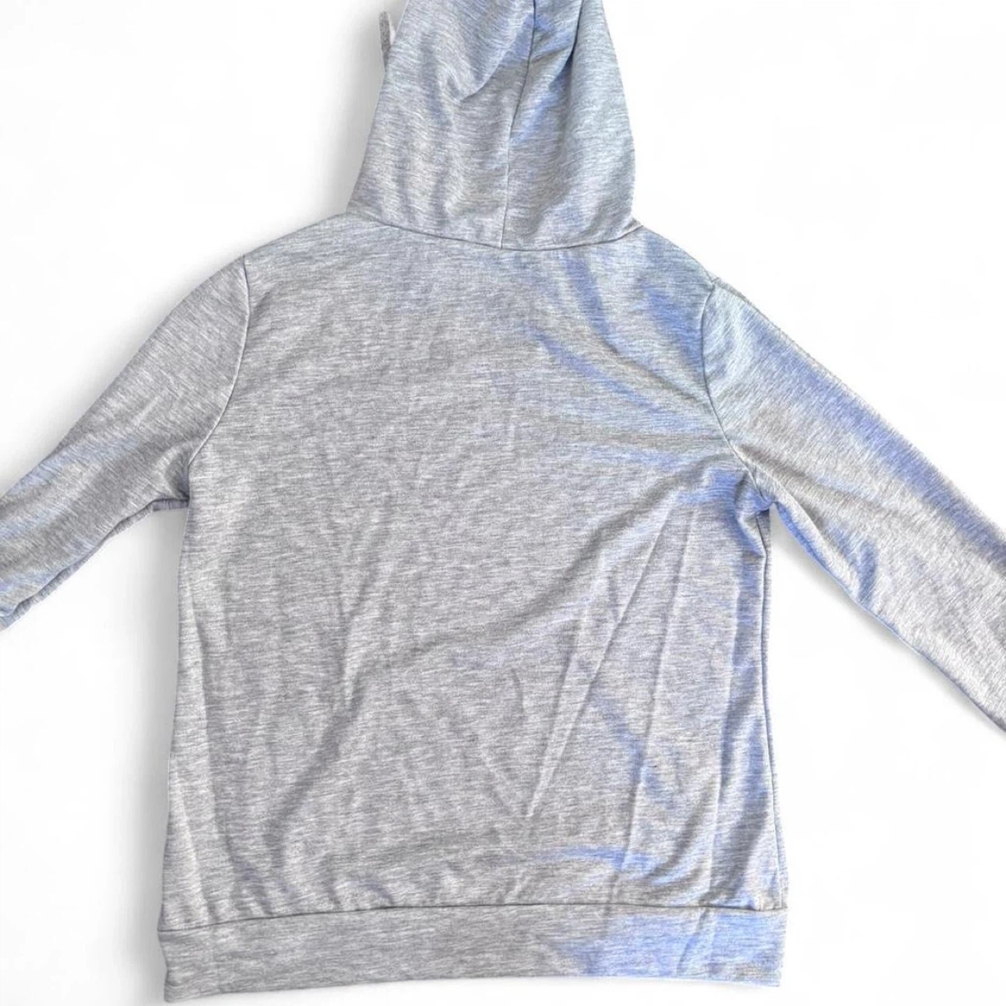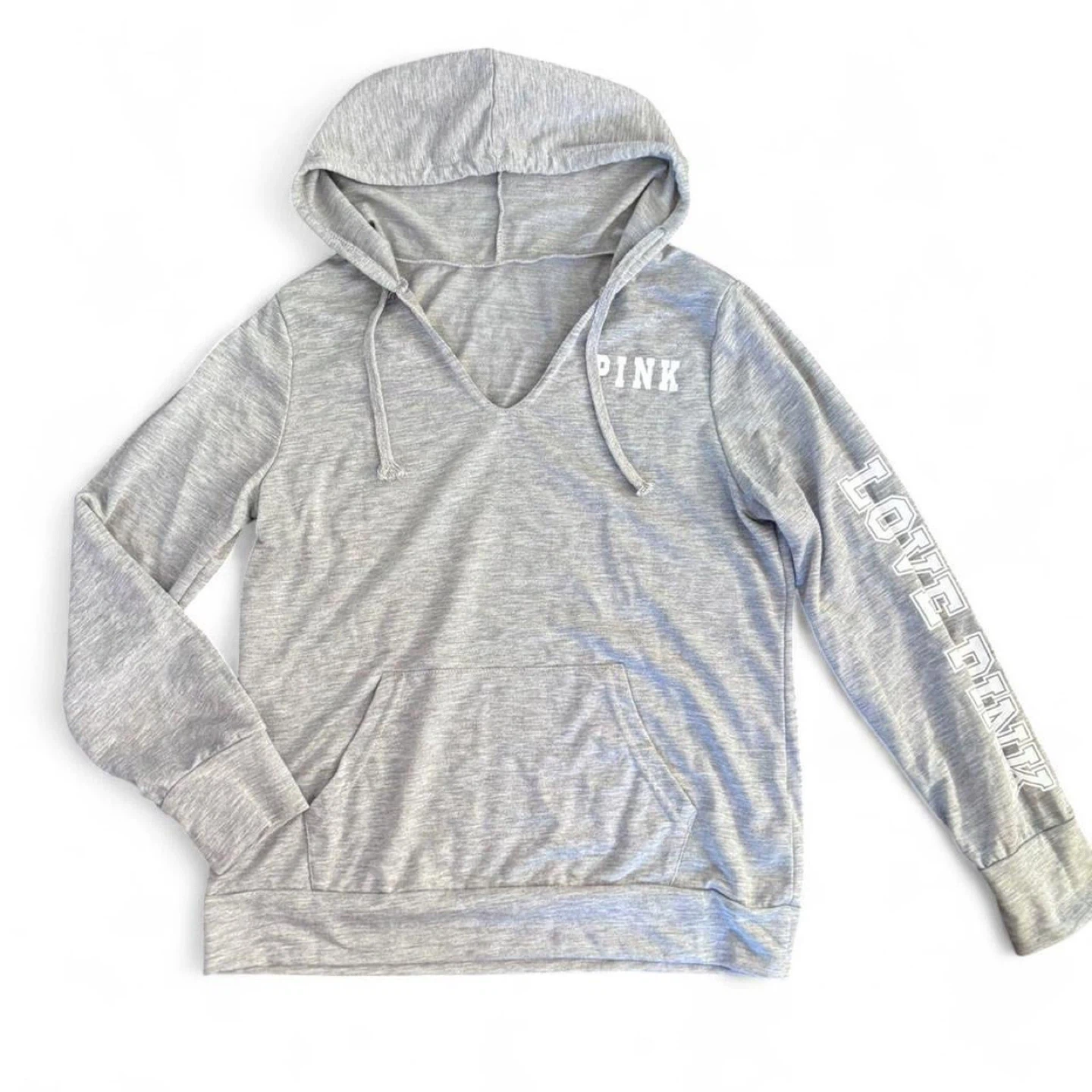 This is a grey PINK hoodie from Victoria's Secret. It's a comfortable pullover with a V-neck and a front kangaroo pocket. The "LOVE PINK" graphic is on the left sleeve. This hoodie is perfect for casual wear and lounging.