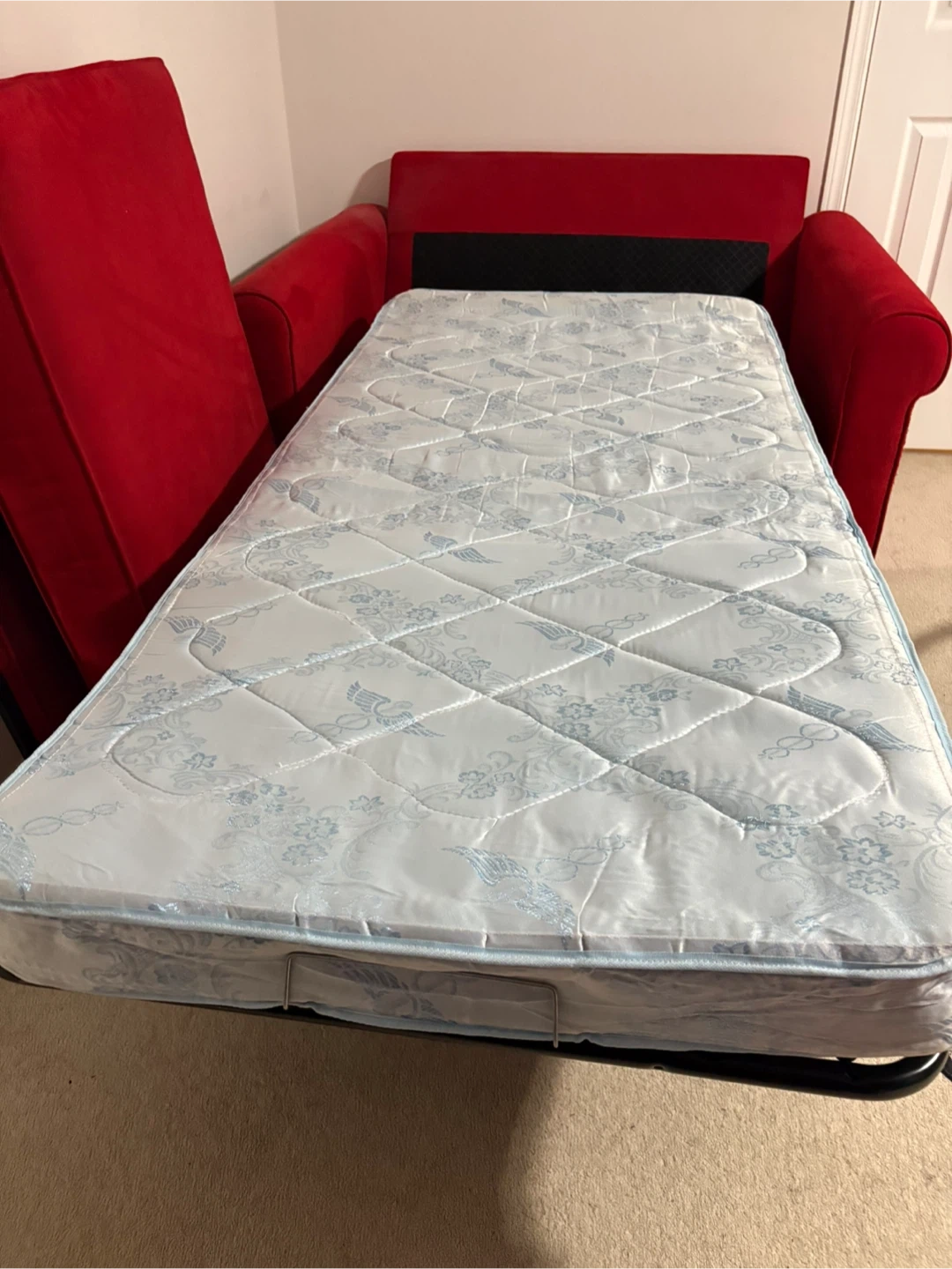 Buy & SellRed Sleeper Chair with MattressRed Sleeper Chair with Mattress$153This is a red sleeper chair that converts into a bed. It includes a mattress. Perfect for small spaces or guest rooms!ConditionLike newWHERE TO MEET370 georgian driveView MapSELLERverifiedAbhiGeorgian College701 review1 chats·2 favorites·23 viewsSEND CHAT TO SELLERHi Abhi! I’m interested in your listing.Hi Abhi! I’m interested in your listing.Get the Karrot app to chatSign In to chat
