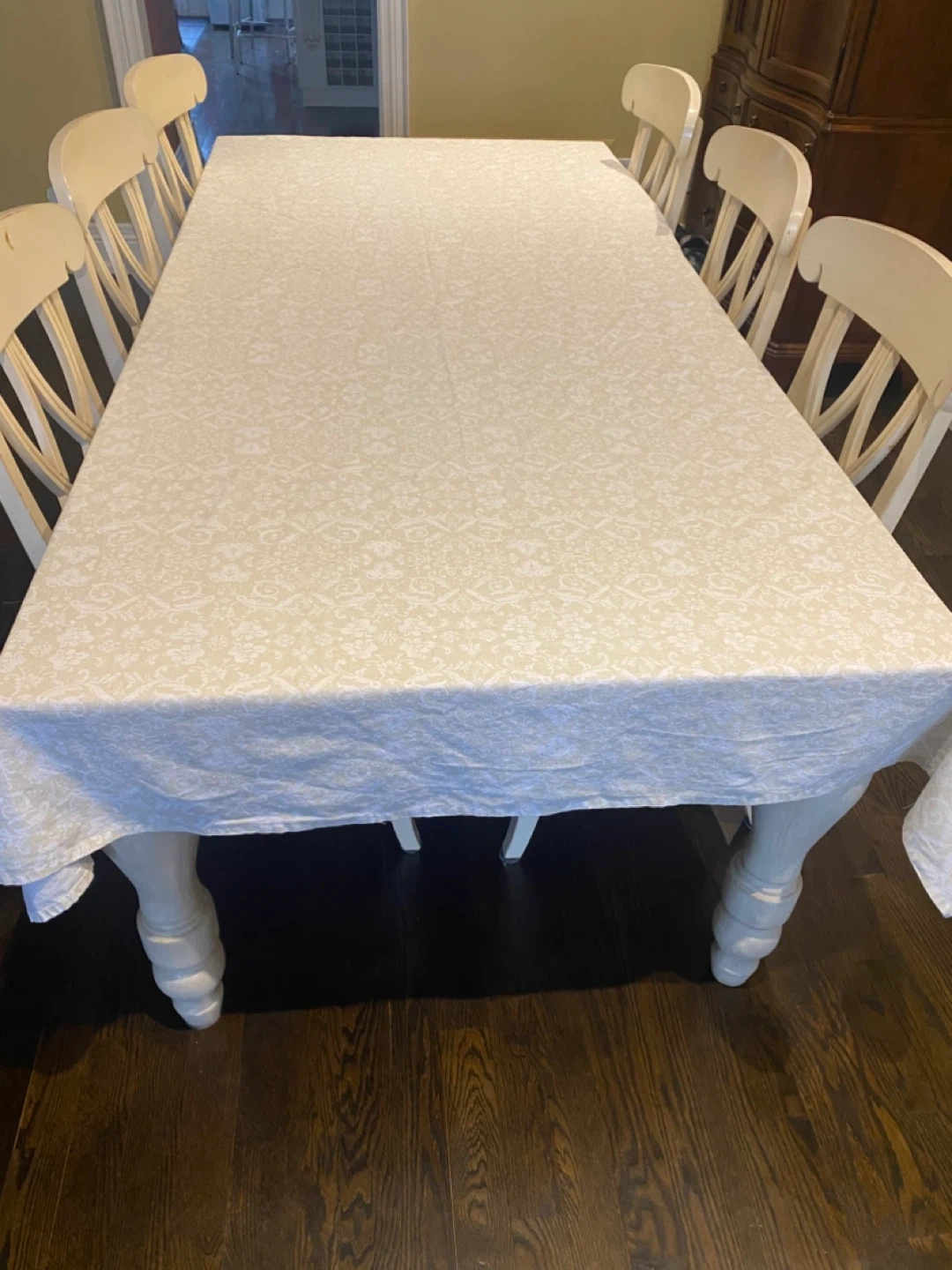 Ashuley cotton cream tablecloth with a delicate floral pattern. It's perfect for adding a touch of elegance to your dining room. Machine washable fabric.