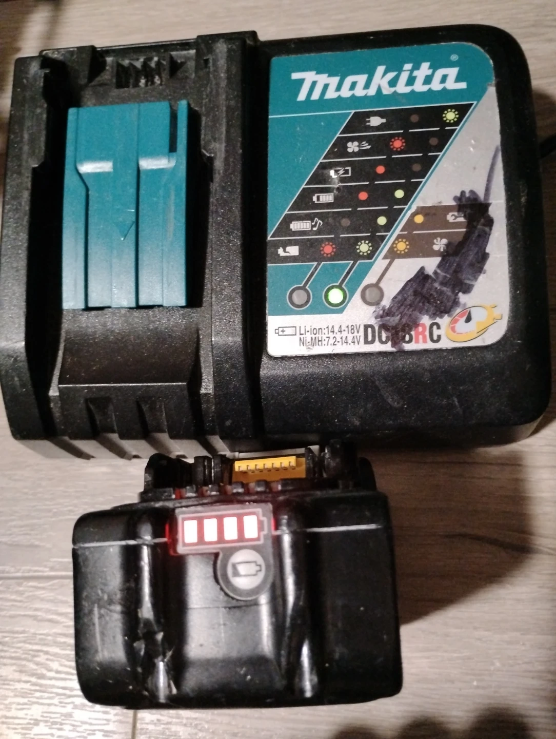 Includes a Makita 18V LITHIUM-ION 4.0Ah battery and a DC18RC charger. The battery has indicator lights showing its charge level. Charger is compatible with 14.4-18V Ni-MH and Li-ion batteries.