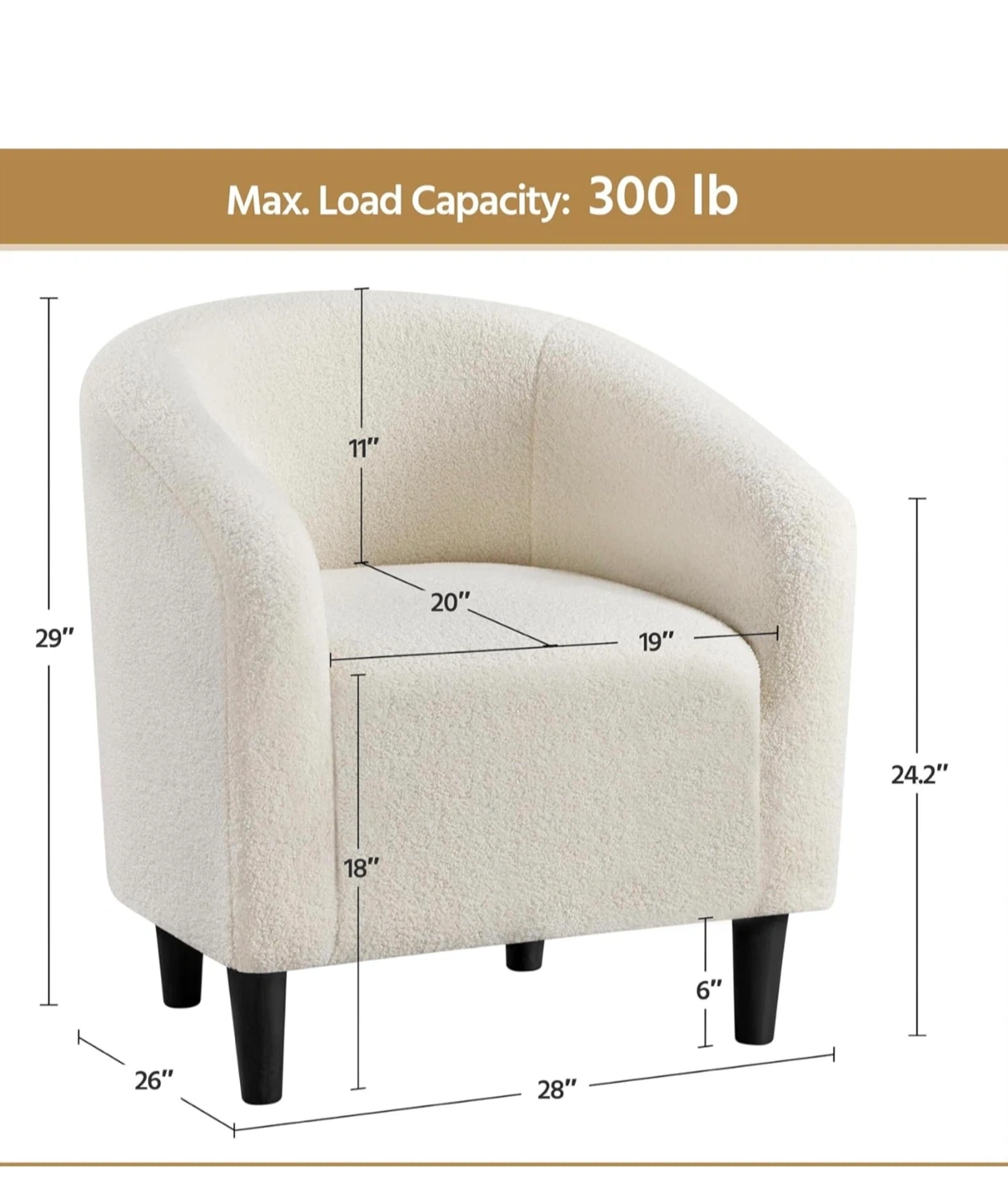 Comfortable accent armchair with a textured bouclé fabric. It has a rounded design and dark, short legs. A striped throw pillow is included with the chair. Two available