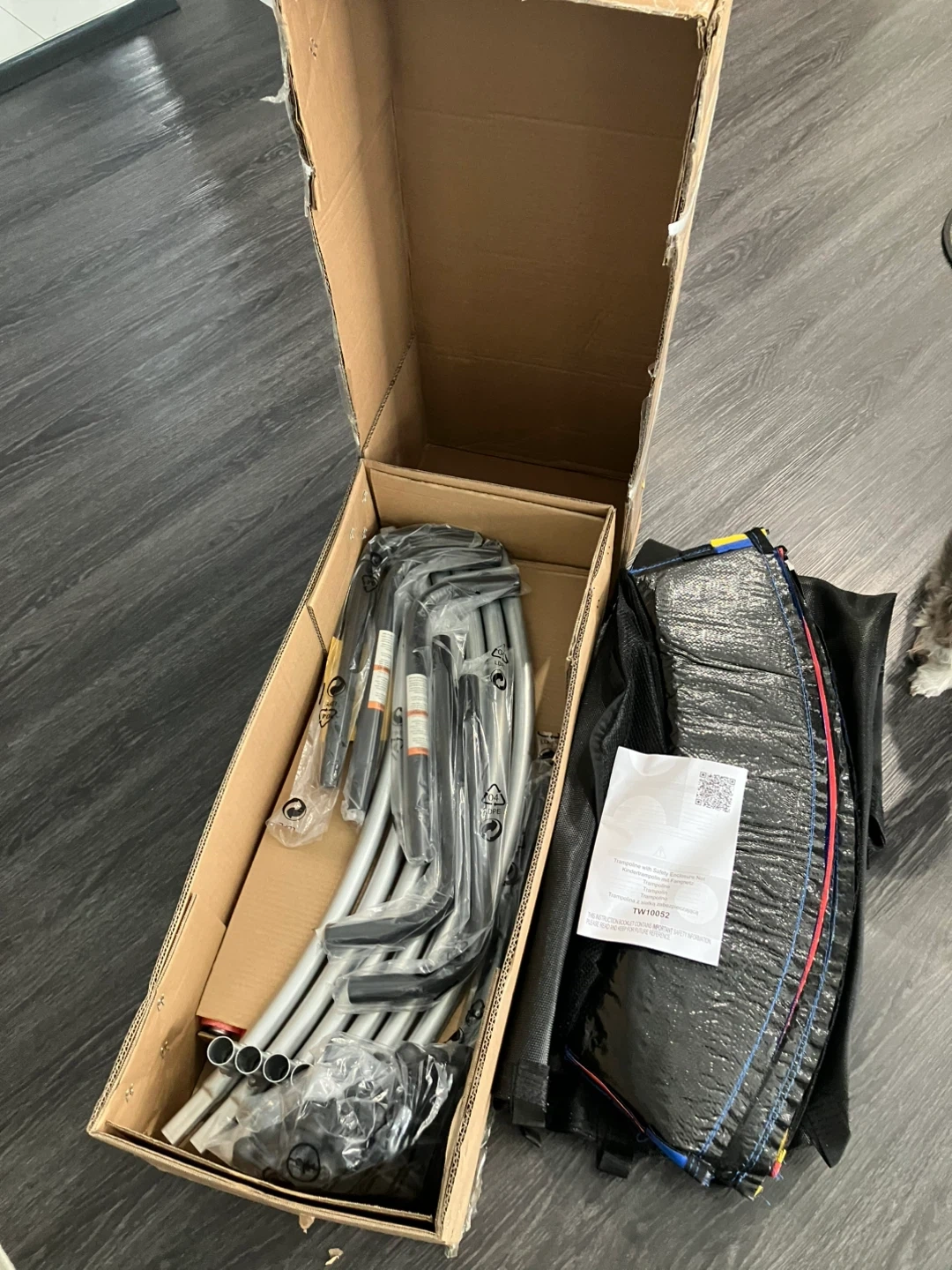 This trampoline is designed for children's indoor or outdoor fun. It features a safety enclosure net to keep jumpers secure. Assembly required from parts in the box.55 inch wide.
