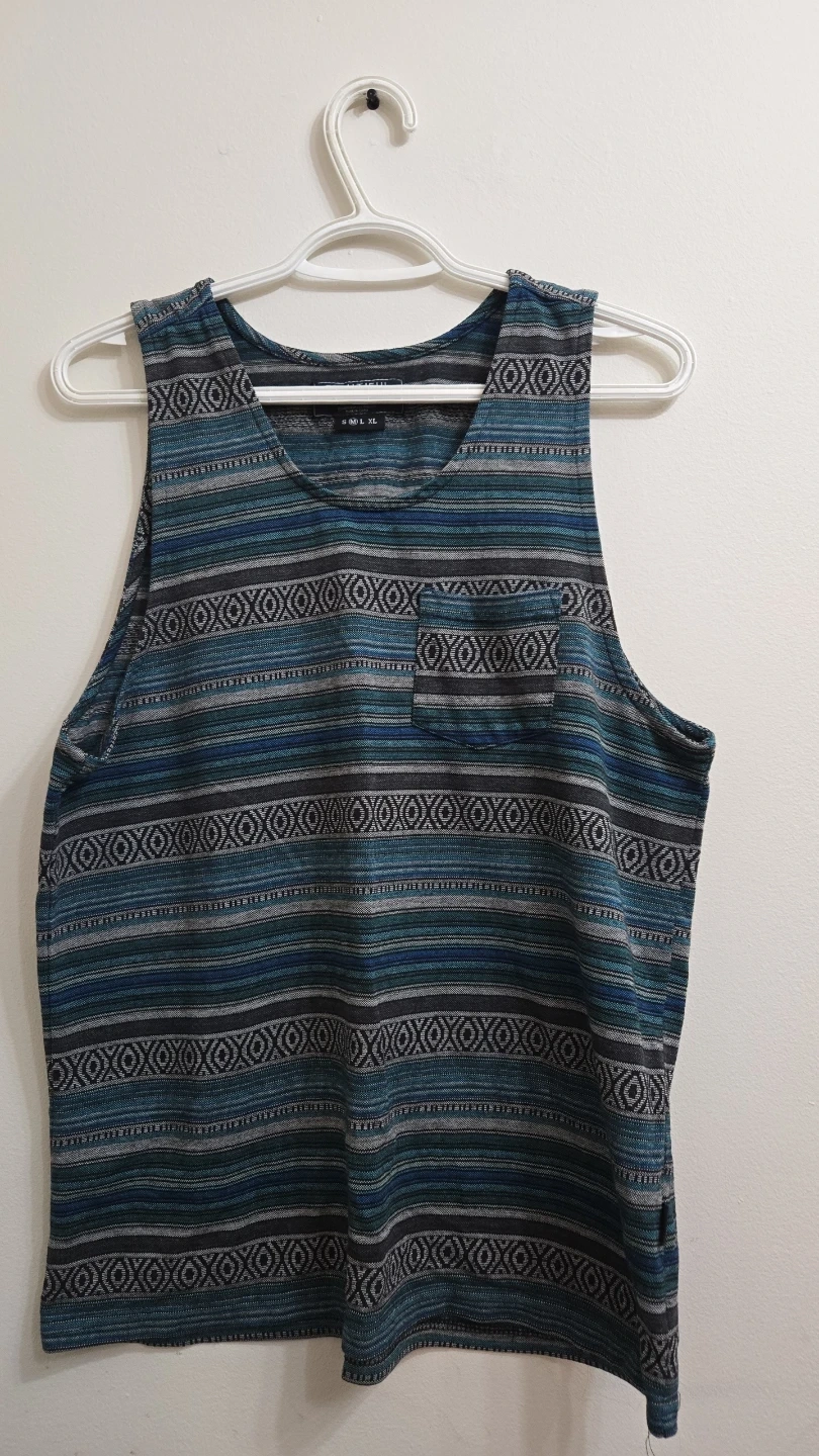 This is a men's tank top from Beautiful Giant. It's a size medium with a multicoloured geometric print. Made from a soft fabric for comfort.