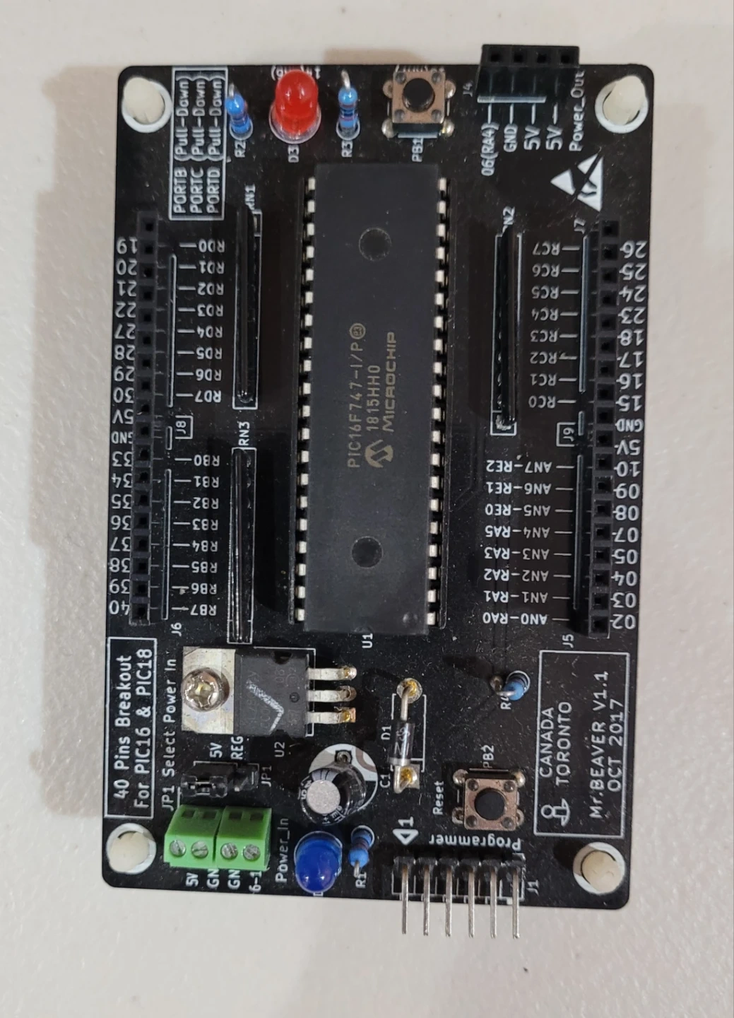 This is a new Centennial Lab Kit servo drive card. It's a M.BEAVER V1.1 programmer, made in Canada, Toronto. The board features a PIC16F747-1/P Microchip controller.