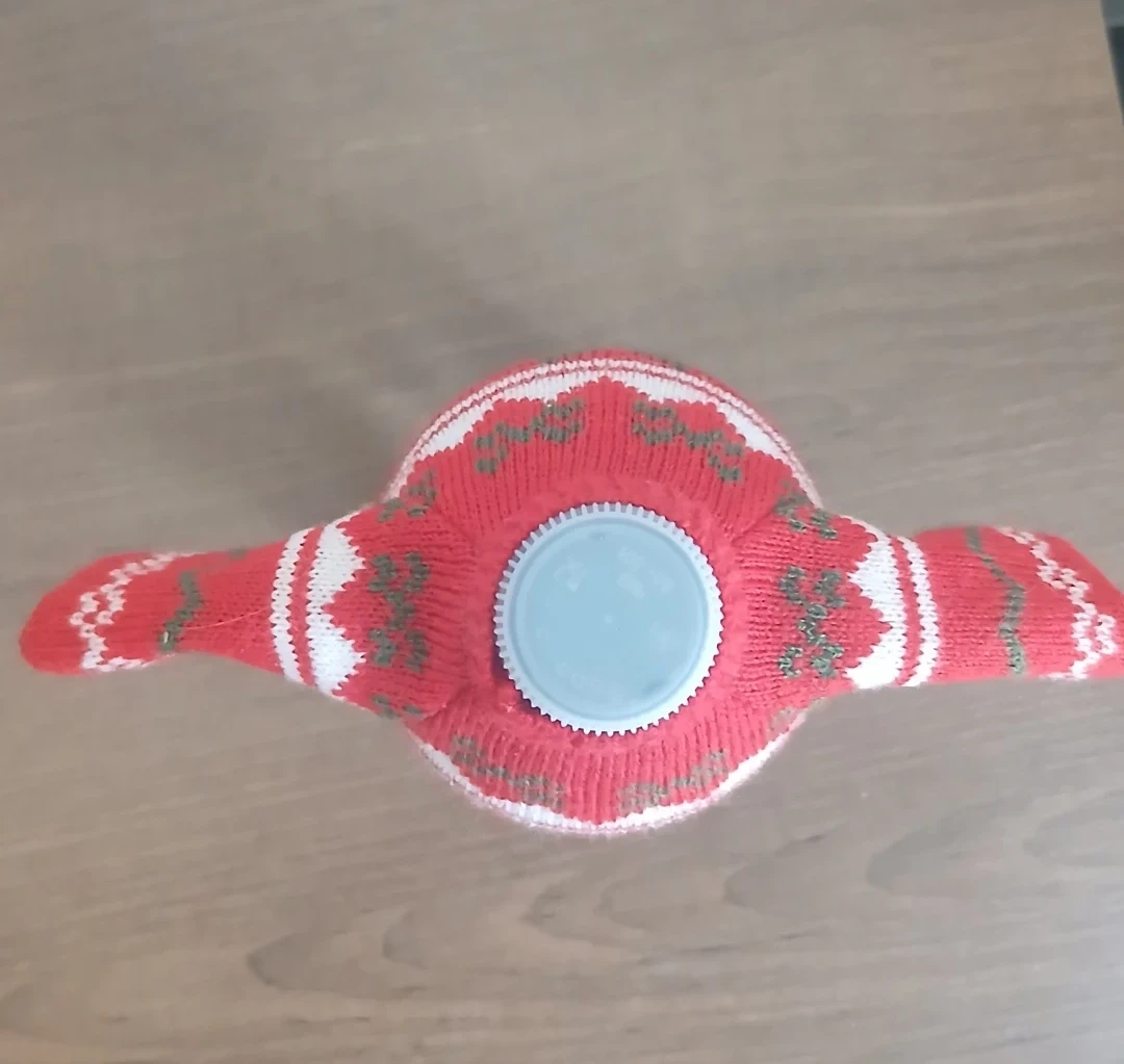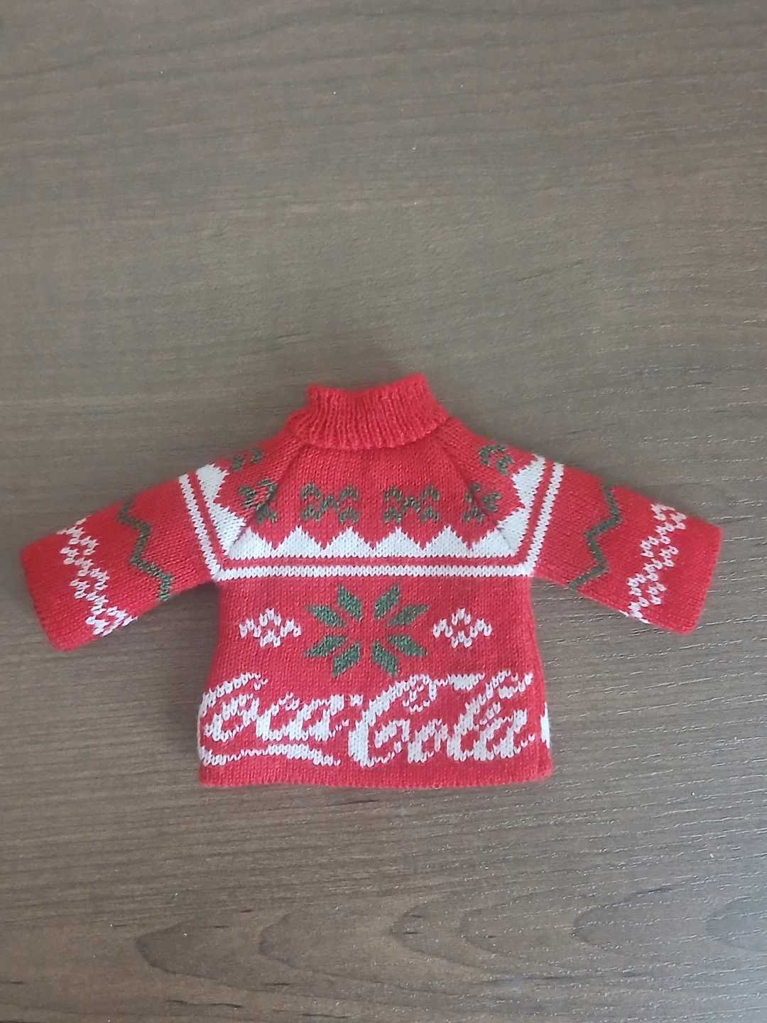 This festive Coca-Cola bottle cozy features a classic Christmas sweater design with snowflakes and the iconic logo. It's knitted and fits snugly around standard bottles to add some holiday cheer. Perfect for keeping your beverage cool and your hands warm during the holiday season!